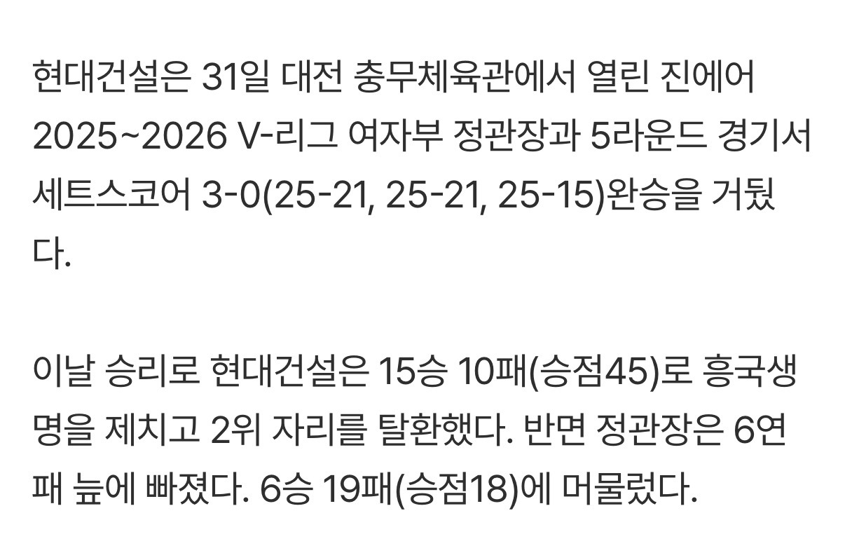 [여시뉴스데스크]'정지윤 공백 없다' 현대건설 셧아웃 완승, '인쿠시 분전에도' 정관장 6연패 어쩌나 [MD대전] 작성자슈퍼펭귄시리얼|작성시간26.01.31|조회수2,059 목록 댓글 3 글자크기 작게가 글자크기 크게가 출처: https://m.sports.naver.com/volleyball/article/117/0004031274'정지윤 공백 없다' 현대건설 셧아웃 완승, '인쿠시 분전에도' 정관장 6연패 어쩌나 [MD대전]여기를 눌러 링크를 확인하세요m.sports.naver.com 다음검색 현재 게시글 추가 기능 열기 북마크 공유하기 신고 센터로 신고 댓글 댓글 3 댓글쓰기 답글쓰기 댓글 리스트 작성자영앤리치치리뱅뱡 | 작성시간 26.01.31 정관장 어카냐 ㅜ 작성자이킁에킁 | 작성시간 26.01.31 감독 나가야 하는거 아님? 작성자매럭우운탕 | 작성시간 26.01.31 정관장... 하 댓글 전체보기