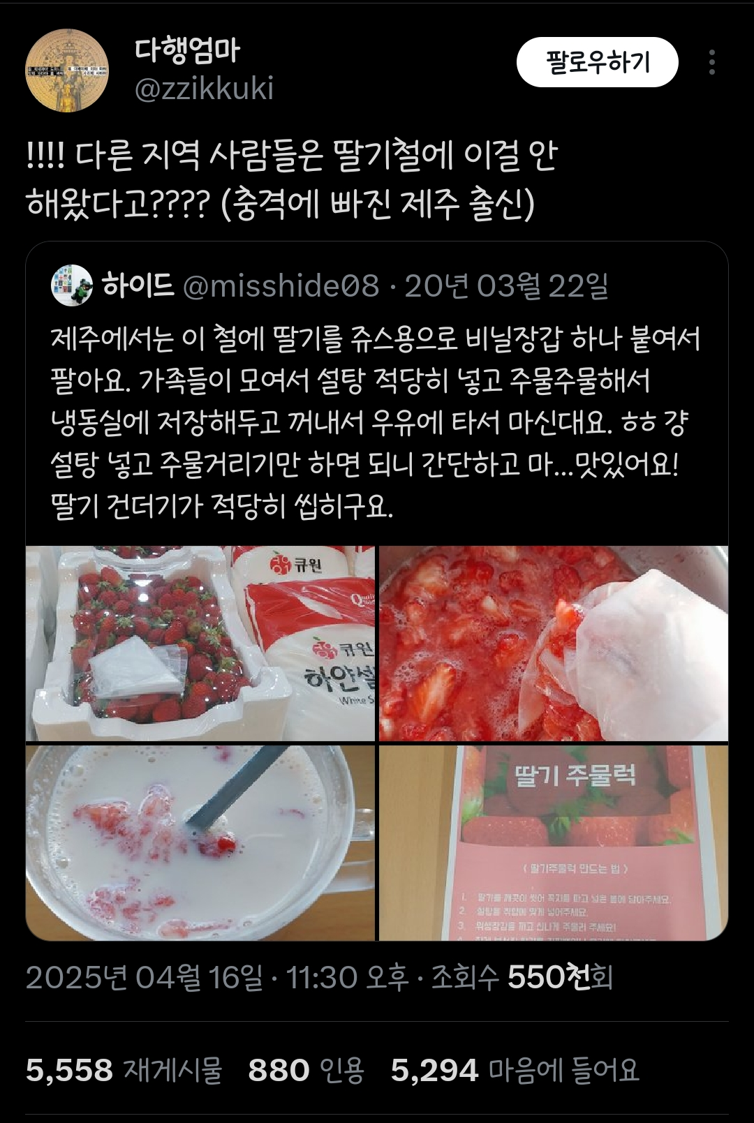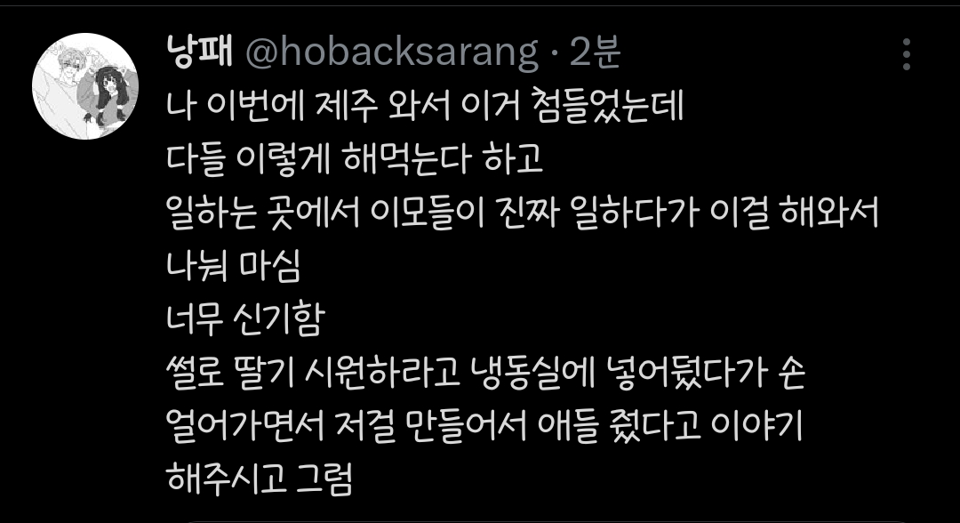 작성자닌깐X 니까O 작성시간 26.02.01 뭐랭하멘 인스타에서 봤는데 주물럭은 설탕비율이 더 낮고(냉동저장해야됨) 딸기라떼 느낌보다 약간 시리얼 먹듯이 주물럭에 우유 좀 첨가해서 먹는느낌이라 함ㅋㅋㅋㅋㅋㅋ