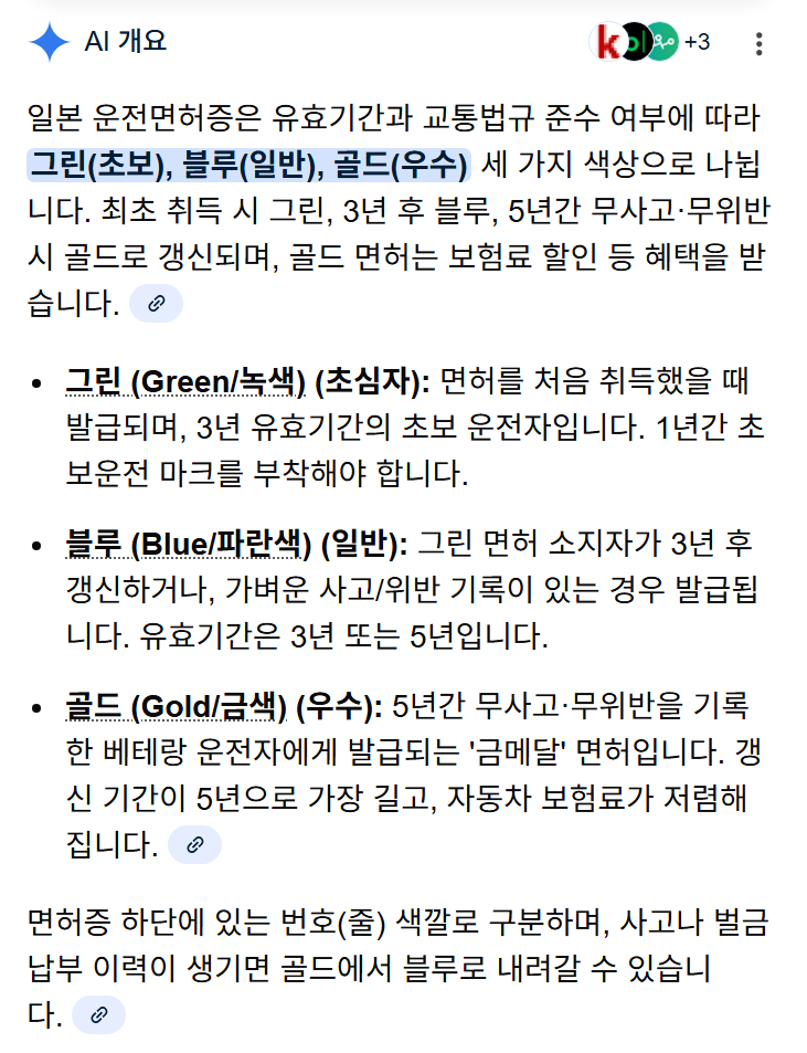 [흥미돋]3가지 종류가 있다는 일본 운전면허증.jpg 작성자pllo|작성시간26.02.01|조회수10,122 목록 댓글 2 글자크기 작게가 글자크기 크게가 출처: 여성시대 pllo 그린 / 블루 / 골드 초보운전 마크(필수)와 고령자 운전 마크(권장) 스티커 면허따고 1년미만이라면 초보운전 스티커 붙이고 다녀야함 어길시 범칙금 '4,000엔'과 '벌점 1점'이 부과. 초보 운전자 스티커, 고령 운전자 스티커 차량에 끼어들기 등 위협 행위 하면 범칙금 '6,000엔'과 '벌점 1점'이 부과 다음검색 현재 게시글 추가 기능 열기 북마크 공유하기 신고 센터로 신고 댓글 댓글 2 댓글쓰기 답글쓰기 댓글 리스트 작성자김주훈 | 작성시간 26.02.01 이건 좋은 거 같다.. 특히 스티커랑 거기에 대한 벌칙금 작성자스피노자사우르스 | 작성시간 26.02.01 이런 건 좀 베껴바 댓글 전체보기