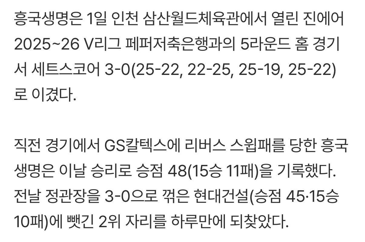 [여시뉴스데스크]'레베카-라셈 37점' 흥국생명 하루 만에 2위 탈환, 페퍼저축은행 3-1 격파[IS 인천] 작성자슈퍼펭귄시리얼|작성시간26.02.01|조회수1,555 목록 댓글 3 글자크기 작게가 글자크기 크게가 출처: https://m.sports.naver.com/volleyball/article/241/0003491799'레베카-라셈 37점' 흥국생명 하루 만에 2위 탈환, 페퍼저축은행 3-1 격파[IS 인천]여기를 눌러 링크를 확인하세요m.sports.naver.com 다음검색 현재 게시글 추가 기능 열기 북마크 공유하기 신고 센터로 신고 댓글 댓글 3 댓글쓰기 답글쓰기 댓글 리스트 작성자연경언니 행배해 | 작성시간 26.02.01 흥국 축하해🩷💜 작성자습하놉하 | 작성시간 26.02.01 라셈 예전에 아비케 용병아니였나?? 답댓글 작성자난 모르겠어 윤오의 진짜 마음을 | 작성시간 26.02.01 맞아 다시왔어 댓글 전체보기