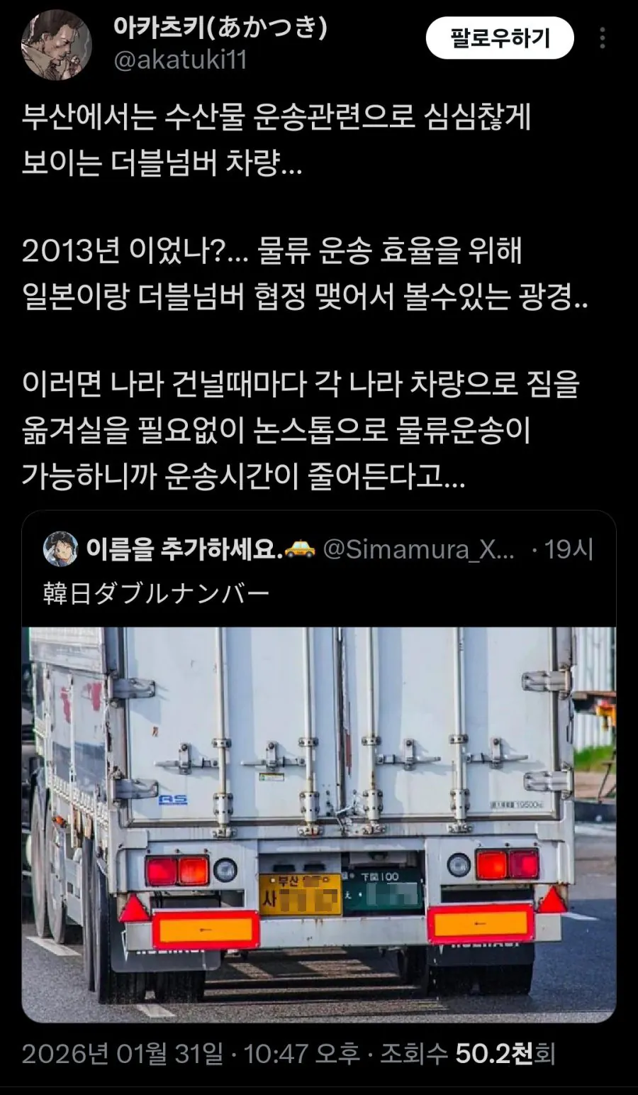 [스크랩] [흥미돋]부산에서만 볼 수 있다는 한국 일본 더블 번호판 차량 작성자Oasis|작성시간26.02.01|조회수59,823 목록 댓글 16 글자크기 작게가 글자크기 크게가 다음검색 스크랩 원문 : 한류열풍 사랑 현재 게시글 추가 기능 열기 북마크 공유하기 신고 센터로 신고 댓글 댓글 16 댓글쓰기 답글쓰기 댓글 리스트 작성자핑구펭구핑구 | 작성시간 26.02.01 운전석이 다른데 어케운전하지?? 작성자햄숫타 | 작성시간 26.02.01 부산사람인데 오 ㅐ처음보는거같지 ㅋㅋ 작성자오랑무탄 | 작성시간 26.02.01 어 저거 신항 근처에서 자주봄부산에서만 보이는거구나? 작성자된단다 | 작성시간 26.02.01 싱기허다! 작성자딥치즈 베이컨 포테이토 | 작성시간 26.02.02 와신기해 댓글 전체보기