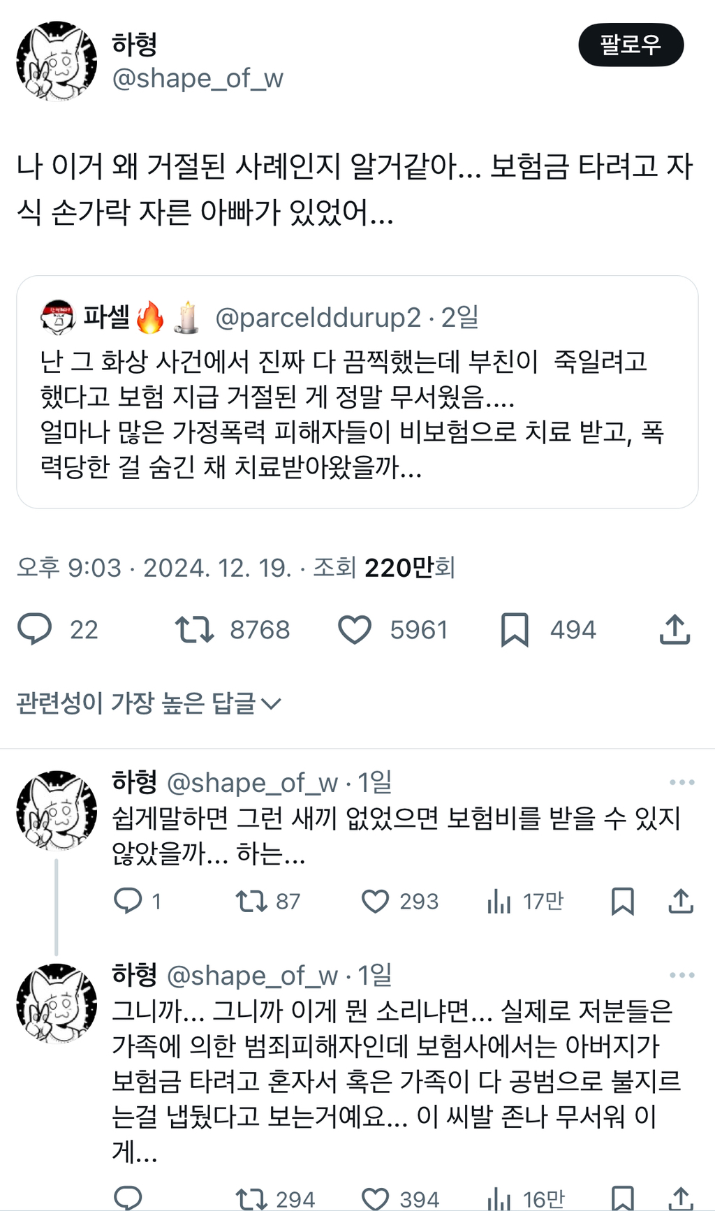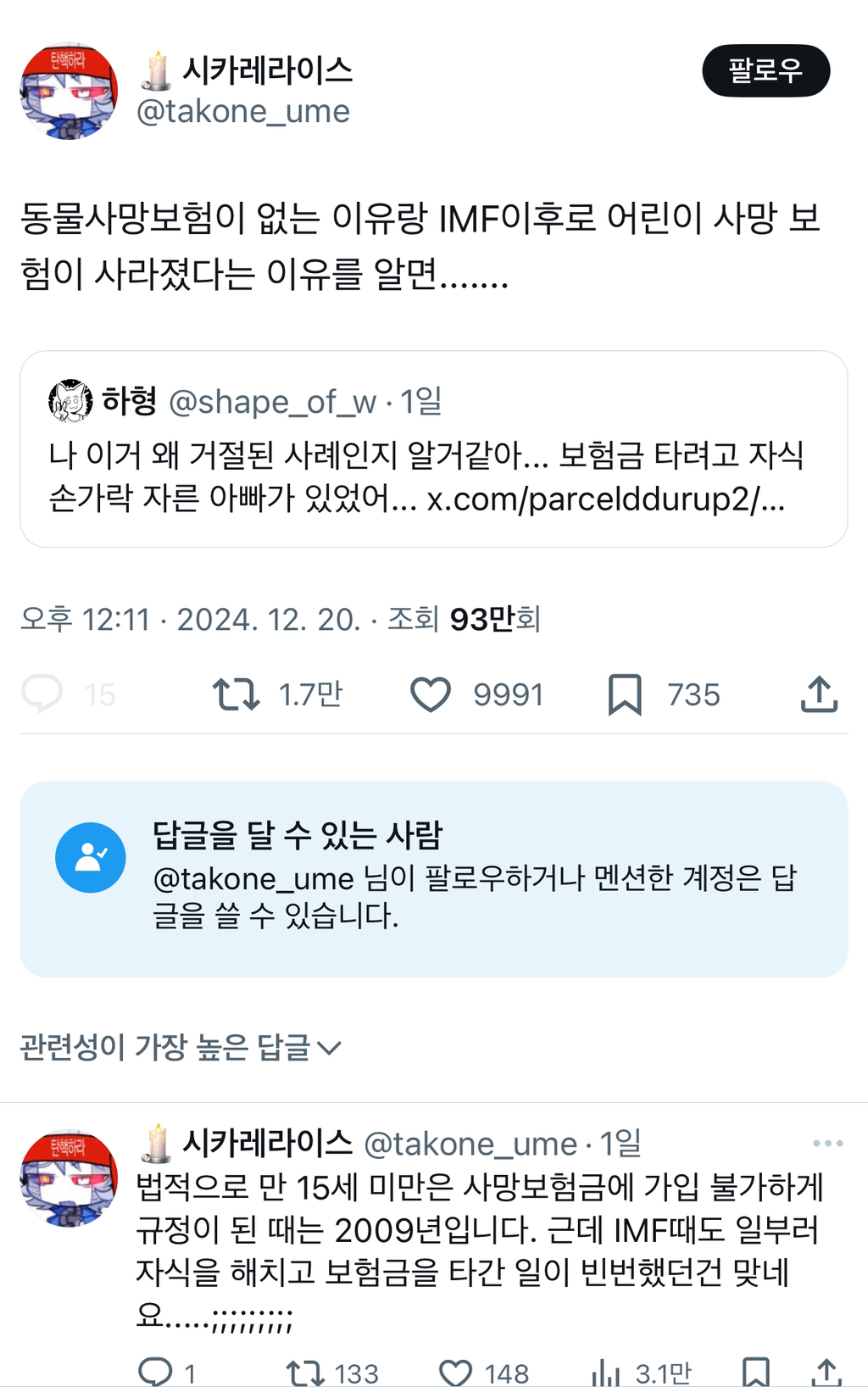 [스크랩] [기타]어린이사망보험이 사라진 이유.. 작성자엥엥ㅇ|작성시간26.02.02|조회수61,358 목록 댓글 16 글자크기 작게가 글자크기 크게가 다음검색 스크랩 원문 : *여성시대* 차분한 20대들의 알흠다운 공간 현재 게시글 추가 기능 열기 북마크 공유하기 신고 센터로 신고 댓글 댓글 16 댓글쓰기 답글쓰기 댓글 리스트 작성자Doosan Bears | 작성시간 26.02.02 인간같지않은 인간들 작성자짱시룸 | 작성시간 26.02.02 소름끼처 작성자잠좀자게해줘 | 작성시간 26.02.02 본인이 뒤지지 ㅜ 작성자악귀야 물러가라 | 작성시간 26.02.02 저기 나오는거처럼 동물도 사망 담보가 안잡힘...잡혀도 진짜 소액만 잡혀 이유...고의로 입양해서 죽일까봐 작성자푹 신 | 작성시간 26.02.02 학교보다 병원을 더 많이 가는 애기도 있더라... 댓글 전체보기