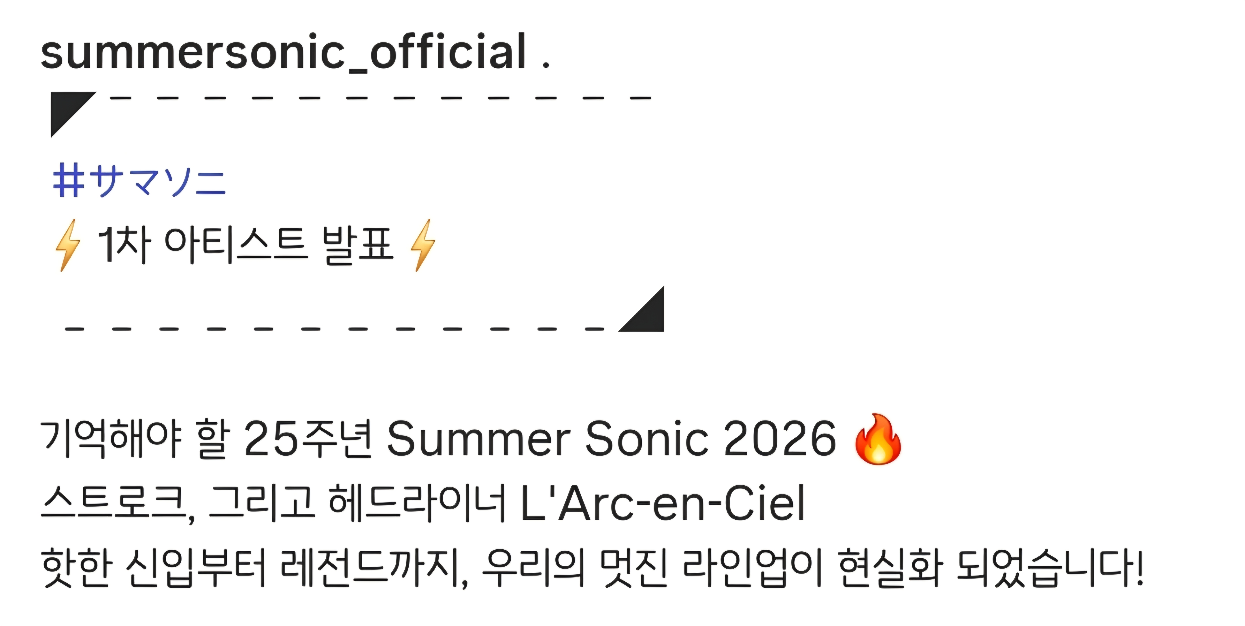 [흥미돋]2026 섬머소닉 1차 라인업 발표 작성자하츠웨이브|작성시간26.02.02|조회수16,592 목록 댓글 61 글자크기 작게가 글자크기 크게가 출처: 여성시대 하츠웨이브https://www.instagram.com/p/DUPVn--D0rp/로그인 • Instagram여기를 눌러 링크를 확인하세요www.instagram.com 다음검색 현재 게시글 추가 기능 열기 북마크 공유하기 신고 센터로 신고 댓글 댓글 61 댓글쓰기 답글쓰기 댓글 리스트 작성자이재명할아버지 | 작성시간 26.02.02 광복절 에바 작성자붱철조교님 | 작성시간 26.02.02 라르크라고? 작성자아돈기바워 | 작성시간 26.02.02 ㅅㅂ 일본은 왜케 라인업이 좋냐고 작성자yeji | 작성시간 26.02.03 오드리누나 한번만 더 왔으면 좋겠다... 작성자자이툰 | 작성시간 26.02.04 25주년이라 제니 부른 건가 댓글 전체보기