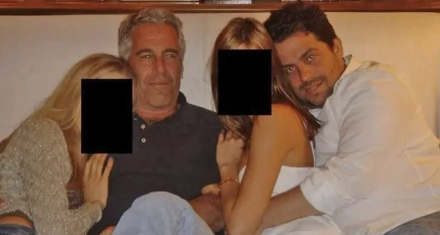 그는 공개된 사진에서 엡스타인과 소파에 앉아 젊은 여성의 허리에 팔을 감고 껴안고 있다.