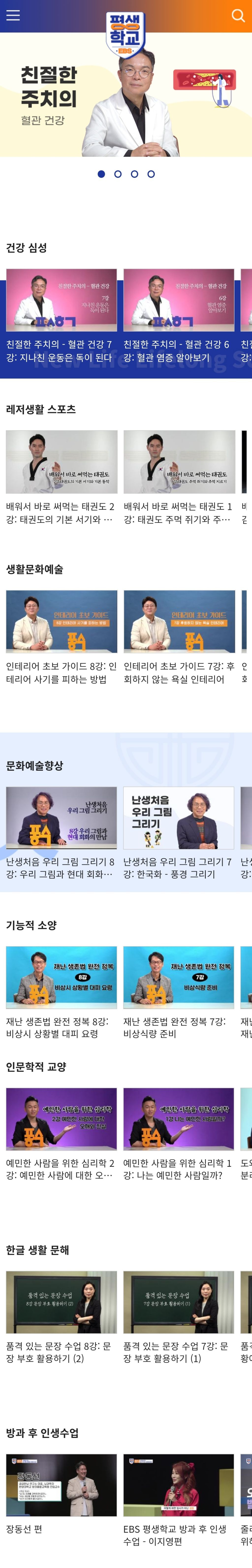 건강, 레저 스포츠, 문화예술, 기타소양, 인문학, 한글, 기타 각종 생활정보 등등