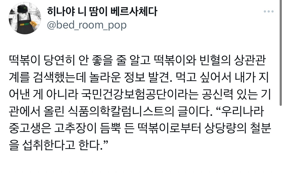 [스크랩] [흥미돋]떡볶이 꼭 먹어야 하는 이유(feat.빈혈) 작성자열빙어|작성시간26.02.02|조회수42,088 목록 댓글 41 글자크기 작게가 글자크기 크게가 출처 : https://twitter.com/bed_room_pop/status/1636010329615503360?s=46&t=KlDqBlNqBJ3fwIZTZ3FsOg내가 이래서 떡볶이 먹었지 다음검색 스크랩 원문 : *여성시대* 차분한 20대들의 알흠다운 공간 현재 게시글 추가 기능 열기 북마크 공유하기 신고 센터로 신고 댓글 댓글 41 댓글쓰기 답글쓰기 댓글 리스트 작성자여시쩔어 | 작성시간 26.02.02 그래????? 작성자홈런볼런홈 | 작성시간 26.02.02 어쩐지 땡기더라니 작성자나이 탐험가 | 작성시간 26.02.03 나 진짜 빈혈있어 작성자조기화 | 작성시간 26.02.03 스뎅도 되나요... 작성자지난주말 | 작성시간 26.02.20 아 요즘 떡볶이 참았더니 그래서 빈혈 생겻구만그래 댓글 전체보기