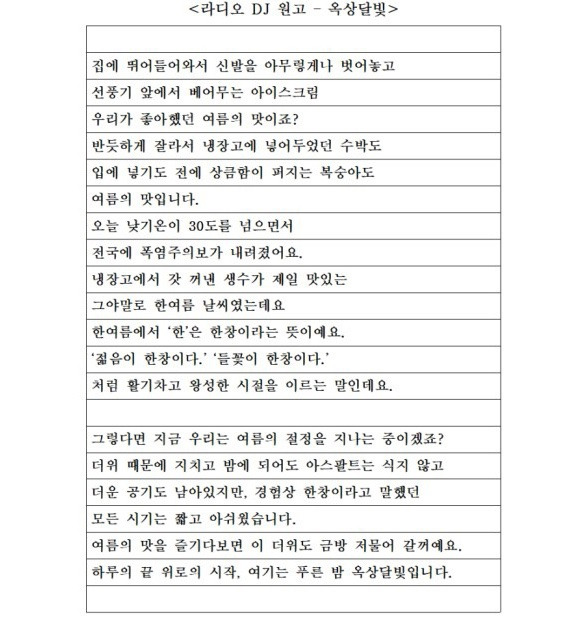 [흥미돋]한여름을 표현한 라디오 원고 작성자할렐야룰|작성시간26.02.03|조회수44,206 목록 댓글 64 글자크기 작게가 글자크기 크게가 출처: 여성시대 할렐야룰 다음검색 현재 게시글 추가 기능 열기 북마크 공유하기 신고 센터로 신고 댓글 댓글 64 댓글쓰기 답글쓰기 댓글 리스트 답댓글 작성자구강용품 | 작성시간 26.02.03 성수동 대림창고 갤러리래 이미지 확대 답댓글 작성자난다니기 | 작성시간 26.02.03 구강용품 헐 고마워 여시!! 동네 구경다닐때 가봐야지~ 작성자인생뭐있어1 | 작성시간 26.02.03 라디오는 진짜 사람의 마음을 와닿게하는 그런 내용이 넘 좋아... 작성자매머드맛업어 | 작성시간 26.02.03 너무 좋아 ㅠㅠㅠㅠ 작성자서울서울서울 | 작성시간 26.02.03 맘에 들어서 저장했어🫢 댓글 전체보기