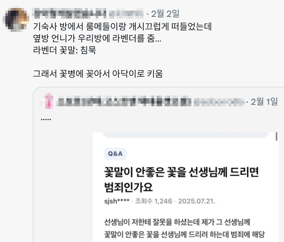 [흥미돋]옆방언니가 라벤더를 줬어...... 이거 무슨의미야? 작성자돼지어터|작성시간26.02.03|조회수53,523 목록 댓글 27 글자크기 작게가 글자크기 크게가 출처: https://x.com/ili101ili/status/2017978019554771407 조용히 하라고 다음검색 현재 게시글 추가 기능 열기 북마크 공유하기 신고 센터로 신고 댓글 댓글 27 댓글쓰기 답글쓰기 댓글 리스트 작성자패턴 | 작성시간 26.02.03 와 나는 받아도 꽃말 찾아볼 생각도 못했을듯 작성자도토리다람디 | 작성시간 26.02.03 도쿄사람인가 눈치챈 ㄱㅆ이도 대단하다 나였으면 선물고르고있을듯 작성자시어머니 형님 | 작성시간 26.02.03 아닥잌ㅋㅋㅋㅋ 작성자빈교실 | 작성시간 26.02.03 개시끄럽게 떠든 걸 인지하고있었군 작성자팝흐리카 | 작성시간 26.02.03 으 얼마나 시끄럽게 했으면 댓글 전체보기