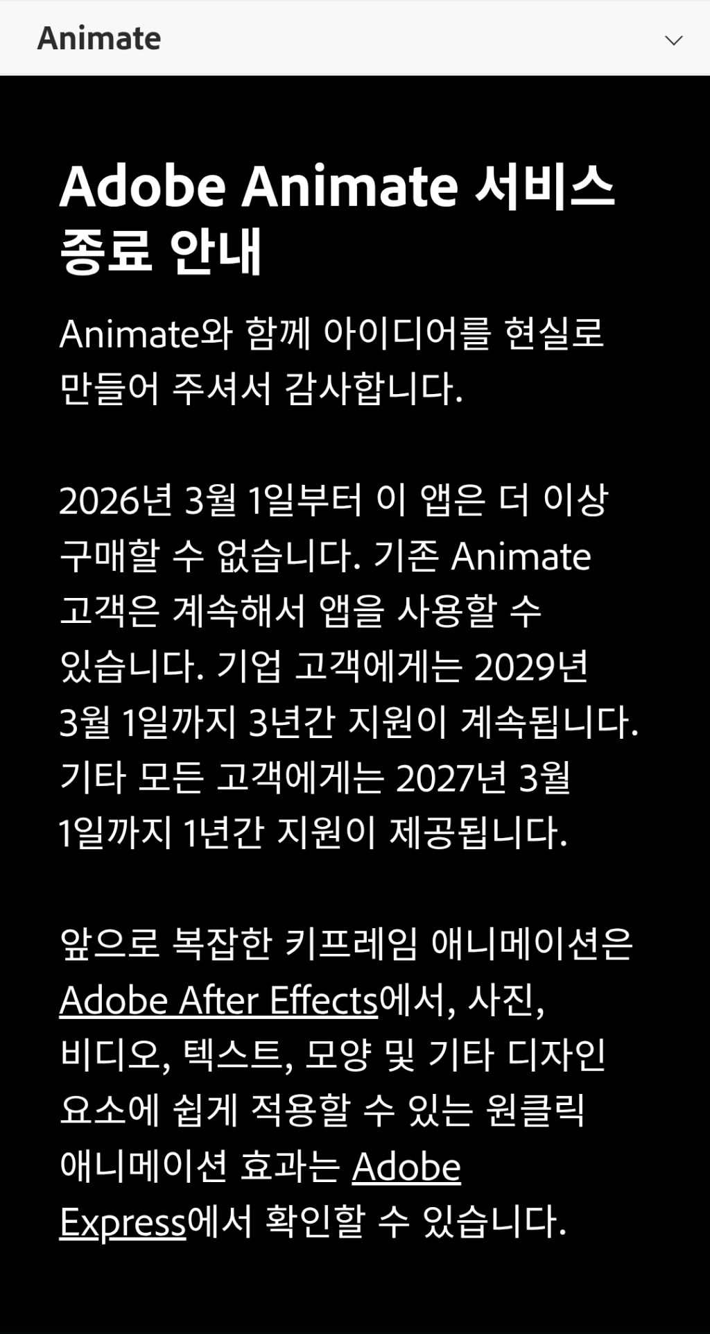 사용자들의 반발에 대해 어도비는 "25년간 애니메이션 생태계를 지원해 온 애니메이트가 더 이상 새로운 기술과 플랫폼에 부합하지 않는다"라며 서비스 종료 배경을 설명했다.