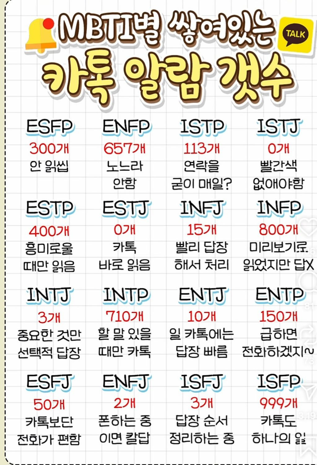 [스크랩] [흥미돋]MBTI별 쌓여있는 카톡 알람 갯수 작성자작고작은|작성시간26.02.03|조회수21,791 목록 댓글 62 글자크기 작게가 글자크기 크게가 다음검색 스크랩 원문 : 쭉빵카페 현재 게시글 추가 기능 열기 북마크 공유하기 신고 센터로 신고 댓글 댓글 62 댓글쓰기 답글쓰기 댓글 리스트 작성자행정안전부 | 작성시간 26.02.03 나 isfp인데 0 작성자너혹시..뭐 돼? | 작성시간 26.02.03 istj 0개… 못참아… 안읽으려고 노력해도 5분 못넘김 작성자에데족 | 작성시간 26.02.04 나 ㄹㅇ모든 알림 다 0개여야해 작성자snfnjrkwkk | 작성시간 26.02.04 istfp 저거 배지숫자 안보이게 바꿈 작성자누나 | 작성시간 26.02.08 나두 잇팁 0ㅋㅋㅋ 댓글 전체보기