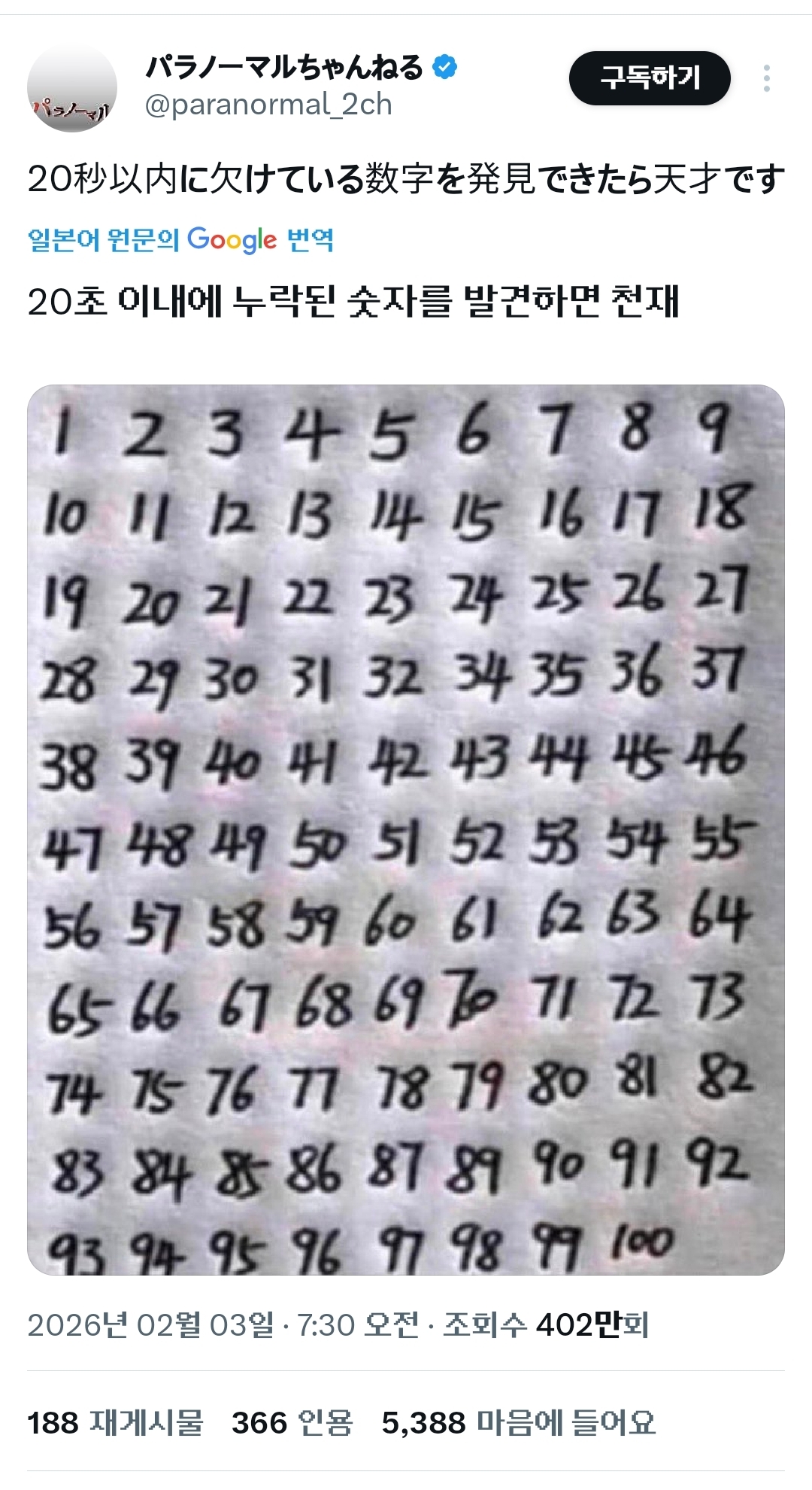 1부터 10부터 대각선으러보면 20,30 이렇게 연뎔되는데 40이랑 90이 줄이 안맞으니까 그러면 20초내에 찾을수있지~ -