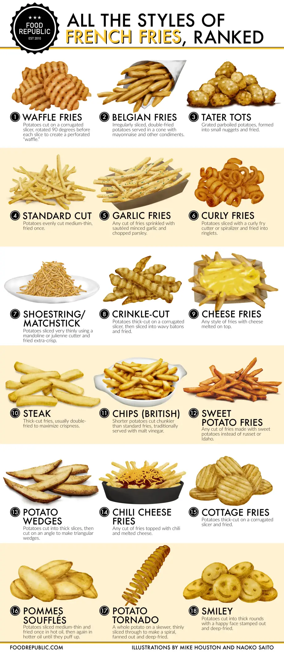 어떤 형태의 감자튀김이든 가능, 볶은 다진 마늘과 파슬리를 뿌림