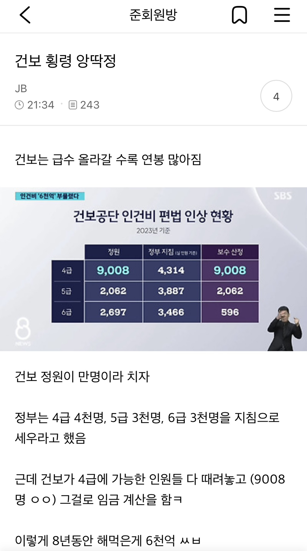 [스크랩] [흥미돋]역대급 사건인듯한 건보 인건비 논란 정리 작성자핑핑피잉|작성시간26.02.03|조회수52,335 목록 댓글 39 글자크기 작게가 글자크기 크게가 출처:https://www.dmitory.com/issue/387710753 다음검색 스크랩 원문 : *여성시대* 차분한 20대들의 알흠다운 공간 현재 게시글 추가 기능 열기 북마크 공유하기 신고 센터로 신고 댓글 댓글 39 댓글쓰기 답글쓰기 댓글 리스트 작성자가가오독 | 작성시간 26.02.03 이게 돼? 건보 공무원 연봉 테이블 적용 아니었어? 진짜몰라서 작성자빵떡면 | 작성시간 26.02.03 회수하고 벌금 때려 ㅅㅂ 작성자빠밤바빰 | 작성시간 26.02.03 금괴가 여기있었네 작성자네이비블라인드 | 작성시간 26.02.03 이거 지들이 승진 안시켯으니 쌤쌤 아니냐 ㅇㅈㄹ 하는데 다른 회사들도 승진적체라서 못시키는건 똑같은데 개같은 논리로 얘기하는거임 작성자나한테 대댓 달지마... | 작성시간 26.02.04 건보료몇년간받지마 댓글 전체보기