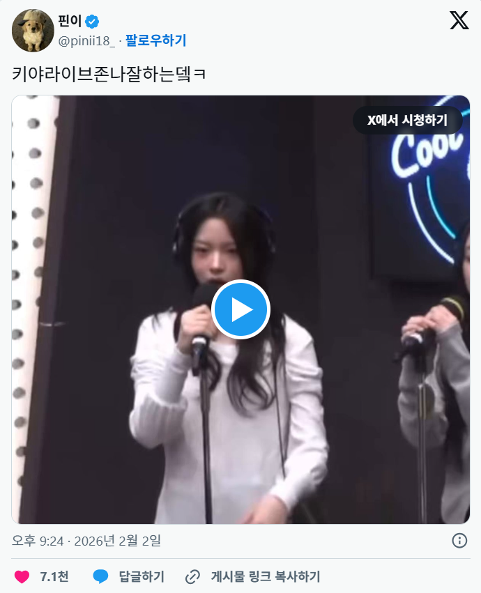 [흥미돋]라이브 잘한다고 트위터 반응 좋은 키키 멤버 작성자두쫀쿠케이크|작성시간26.02.03|조회수32,442 목록 댓글 38 글자크기 작게가 글자크기 크게가 출처: https://theqoo.net/square/4083264092사진 누르면 영상으로 이동사진 누르면 영상으로 이동 도입부에 치고 나오는 발성이 ㄹㅇ 미쳤음 https://youtu.be/qWXlcmhvu5c?si=YxEWfNgTS3pPilVB 다음검색 현재 게시글 추가 기능 열기 북마크 공유하기 신고 센터로 신고 댓글 댓글 38 댓글쓰기 답글쓰기 댓글 리스트 작성자Pon_zoo 폰주 | 작성시간 26.02.03 열정이 보여서 좋아 ㅜ 신인의 맛 작성자AMA ET FAC QUOD VIS YOURS TO MAKE | 작성시간 26.02.04 키야 매력 대박이더라 작성자쪼록 | 작성시간 26.02.04 키야 진짜 매력 미쳤음 ㅠㅠㅠㅠㅠㅠㅠ 요즘 최애야 작성자Anne Shirley Cuthbert | 작성시간 26.02.04 404가 뽀뽀로 들려서 귀여워 작성자꼬아 | 작성시간 26.02.04 10년생?.. 와... 댓글 전체보기