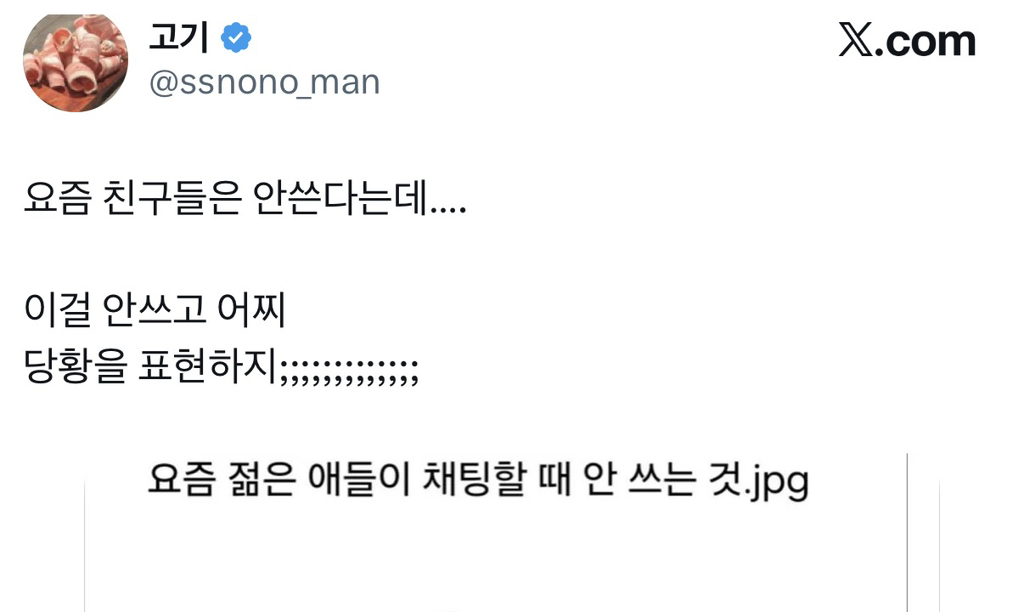 작성자기특상 작성시간 26.02.04 저런 요즘 애들 뭐뭐 안 쓴다 같은 글 올라올 때마다 느끼는 건데 어린 애들 다 잘 쓰거든? 저 분석조차 늙은이가 해서 잘 모르는 건가 싶음 ㅋㅋㅋㅋㅋ