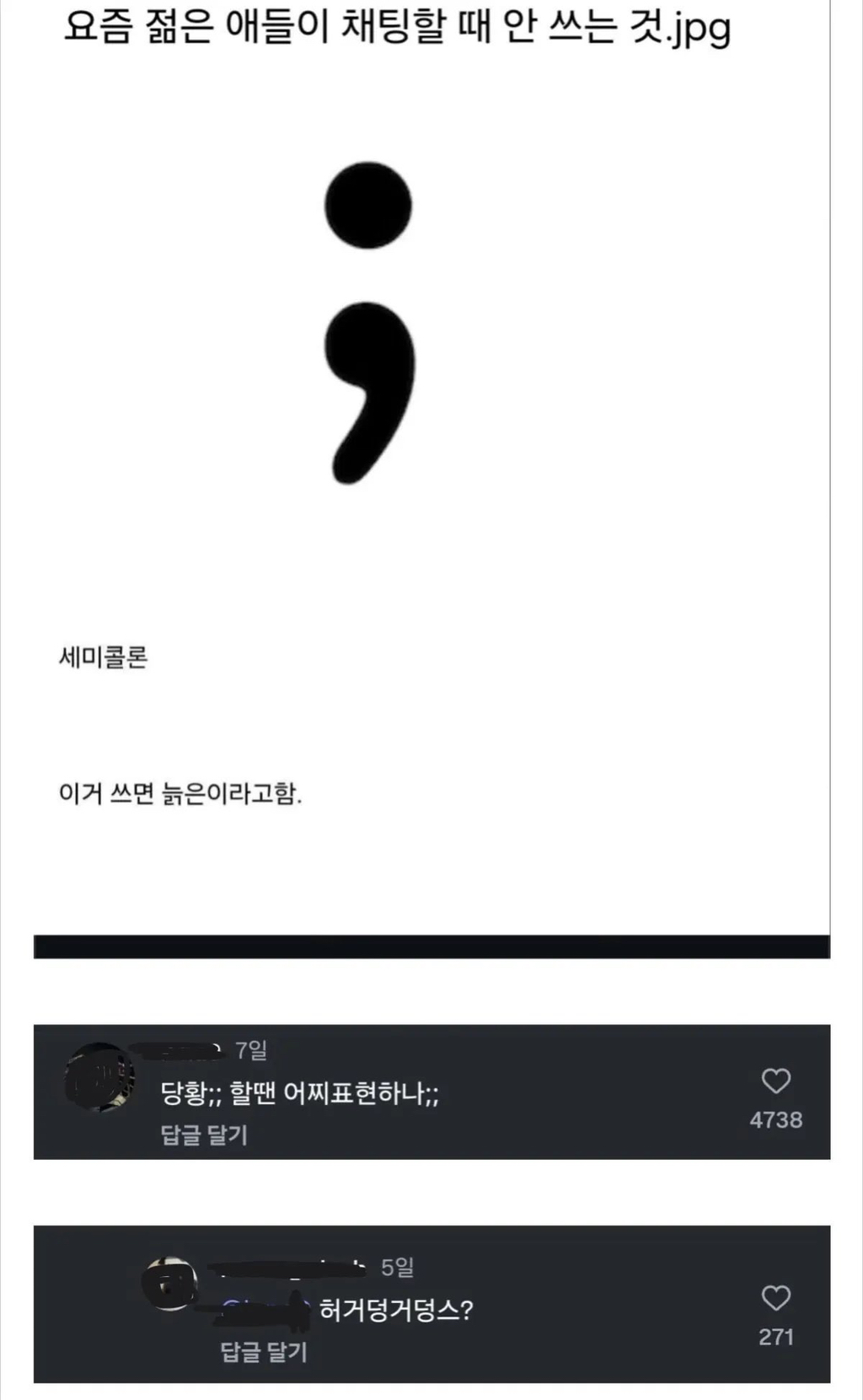 작성자햄쓰북쓰 작성시간 26.02.04 허거덩거덩스 6글자 쓸바에 ; 이게 빠르지!! 다들 세미콜론 쓰도록 에헴
