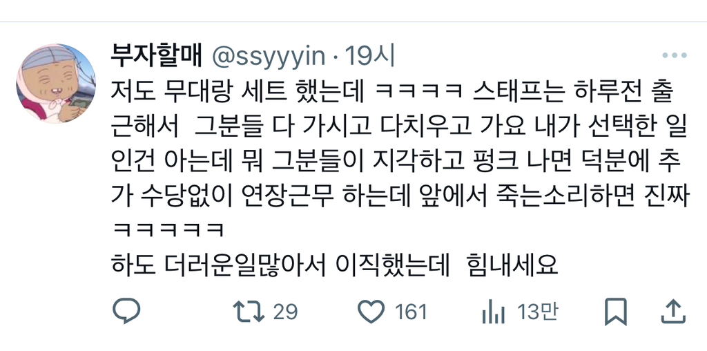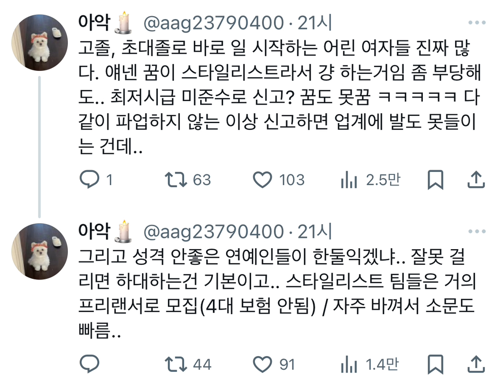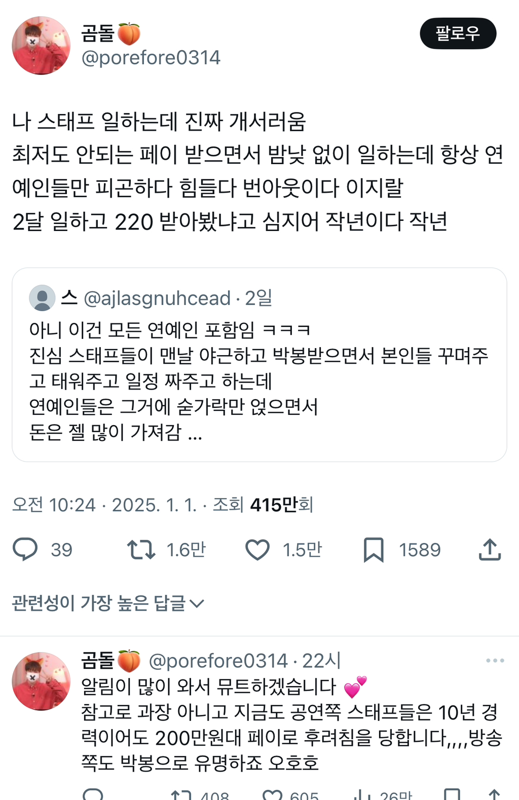 작성자고슷흐 작성시간 26.02.04 방송계는 연예인 빼고 다 불가촉천민임 ㅅㅂ ㅜ