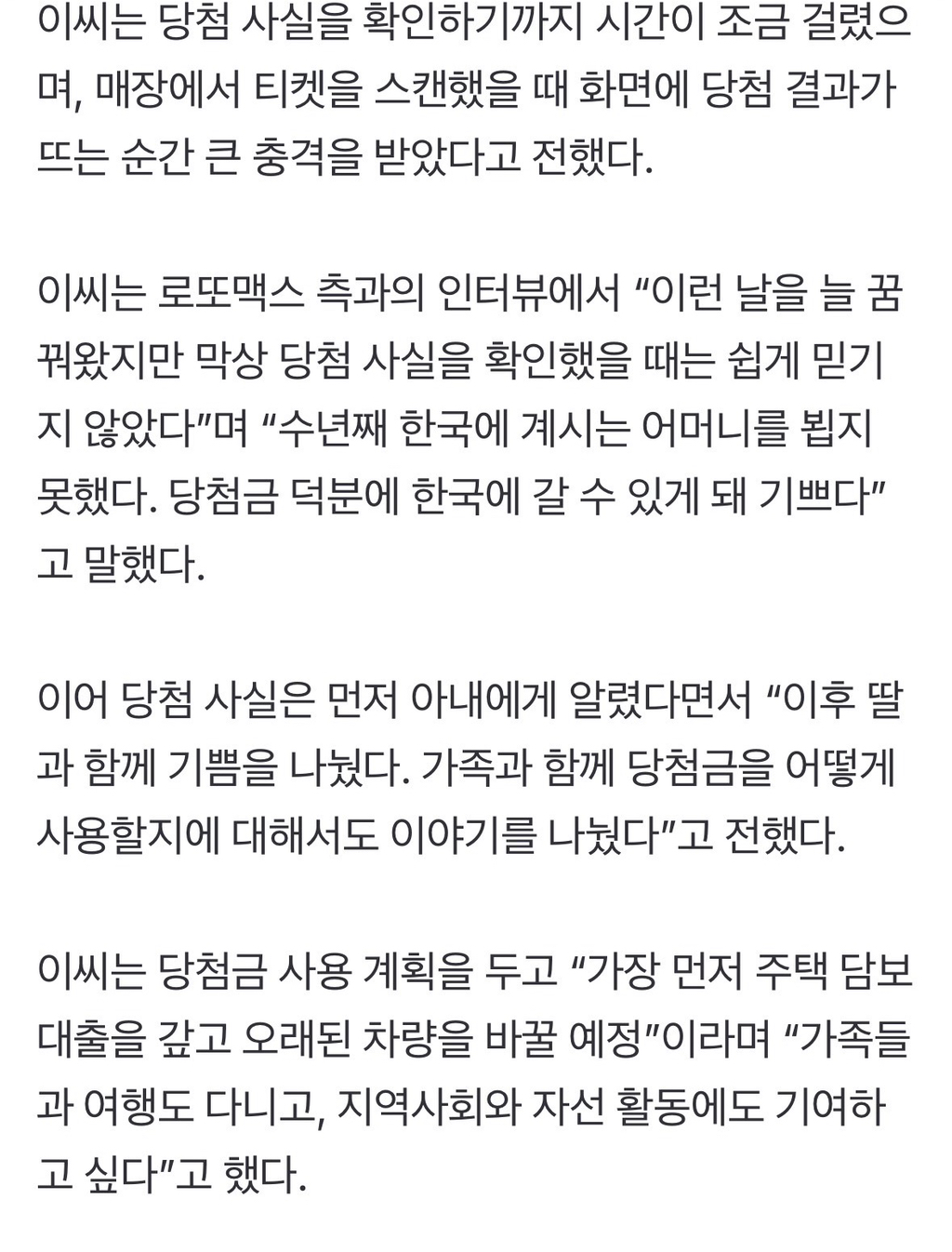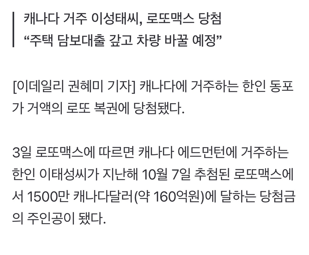 [여시뉴스데스크]“엄마 보러 한국 갑니다”…로또 ‘160억’ 당첨된 캐나다 동포 작성자fabulous|작성시간26.02.03|조회수10,080 목록 댓글 34 글자크기 작게가 글자크기 크게가 출처: https://n.news.naver.com/article/018/0006212605?cds=news_edit“엄마 보러 한국 갑니다”…로또 ‘160억’ 당첨된 캐나다 동포캐나다에 거주하는 한인 동포가 거액의 로또 복권에 당첨됐다. 3일 로또맥스에 따르면 캐나다 에드먼턴에 거주하는 한인 이태성씨가 지난해 10월 7일 추첨된 로또맥스에서 1500만 캐나다달러(약 1n.news.naver.com전문참고축하드립니다 다음검색 현재 게시글 추가 기능 열기 북마크 공유하기 신고 센터로 신고 댓글 댓글 34 댓글쓰기 답글쓰기 댓글 리스트 작성자Impurities | 작성시간 26.02.04 축하드랴요 ㅎㅎ 작성자정지안 | 작성시간 26.02.04 와 너무 부럽다 축하합니다🍀 작성자칠갑그만. | 작성시간 26.02.04 부럽다이 작성자인생루팡하고싶다 | 작성시간 26.02.04 우와 축하드립니다~~ 작성자쥬아b | 작성시간 26.02.04 와... 축하드립니다🍀. 기받아가요~~~🍀 댓글 전체보기