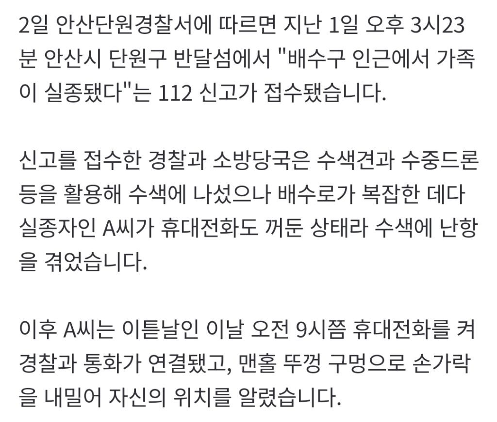 [여시뉴스데스크]맨홀 뚜껑 사이로 '손가락'... 배수 구 들어간 20대 여성, 18시간 만 구조 작성자붕어빵무제한제공참말사건|작성시간26.02.03|조회수9,478 목록 댓글 4 글자크기 작게가 글자크기 크게가 출처: https://naver.me/5Z1EEaO2맨홀 뚜껑 사이로 '손가락'... 배수구 들어간 20대 여성, 18시간 만 구조경기 안산시 반달섬에서 배수구에 들어간 20대 여성이 18시간 만에 구조됐습니다. 2일 안산단원경찰서에 따르면 지난 1일 오후 3시23분 안산시 단원구 반달섬에서 "배수구 인근에서 가족이 실종됐n.news.naver.com전문 출처로 다음검색 현재 게시글 추가 기능 열기 북마크 공유하기 신고 센터로 신고 댓글 댓글 4 댓글쓰기 답글쓰기 댓글 리스트 작성자22세기소녀 | 작성시간 26.02.03 아이고 빠지신 건가? ㅠㅠ 구조돼서 다행 답댓글 작성자와이 우먼킬 | 작성시간 26.02.03 ㄴㄴ 스스로걸어들어갔대 이유가뭐지 답댓글 작성자22세기소녀 | 작성시간 26.02.03 와이 우먼킬 와 전문 보니까 정신질환 있었대 ㅜㅜ 작성자온베이글레몬딜 | 작성시간 26.02.03 전문보니 정신질환이 있다하네.. 댓글 전체보기