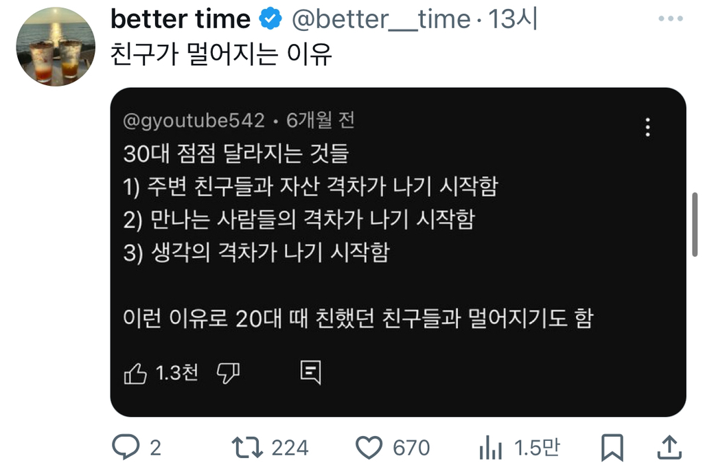 작성자여름토마토 작성시간 26.02.04 생각의 격차 때문에 작년 올해 친구 두명이랑 손절은 아니고 멀어지는중......
