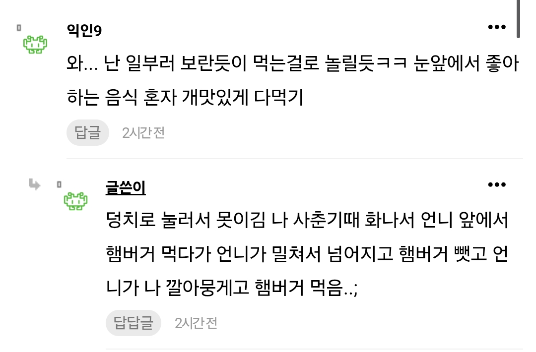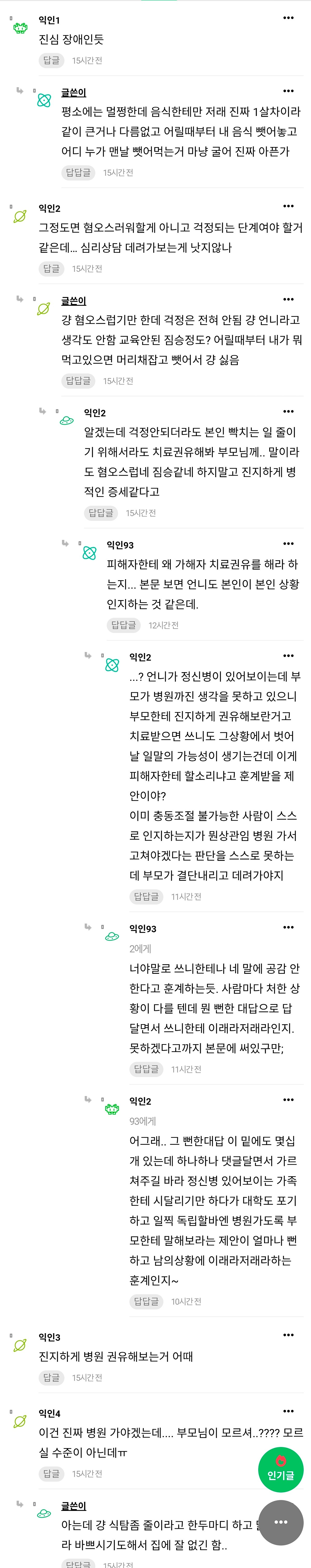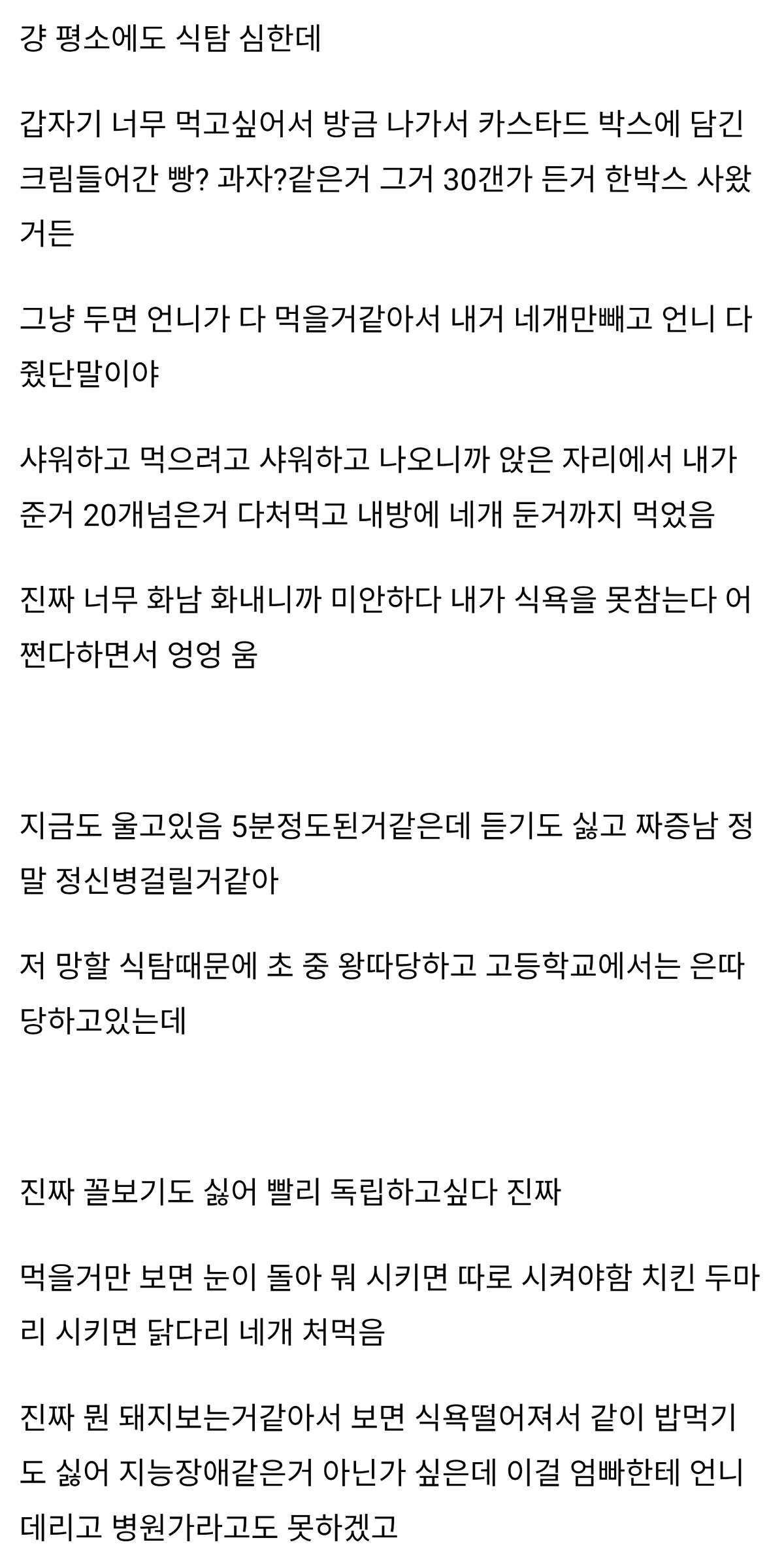[흥미돋]하 진짜 우리 언니 식탐 너무 혐오스러움...jpg 작성자Sunmoonstar02|작성시간26.02.04|조회수104,954 목록 댓글 274 글자크기 작게가 글자크기 크게가 출처: https://www.instiz.net/name_enter/98662051하 진짜 우리 언니 식탐 너무 혐오스러움..걍 평소에도 식탐 심한데갑자기 너무 먹고싶어서 방금 나가서 카스타드 박스에 담긴 크림들어간 빵? 과자?같은거 그거 30갠가 든거 한박스 사왔거든그냥 두면 언니가 다 먹을거같아서 내거 네개www.instiz.net 다음검색 현재 게시글 추가 기능 열기 북마크 공유하기 신고 센터로 신고 댓글 댓글 274 댓글쓰기 답글쓰기 댓글 리스트 작성자그림자그림자ㅡ | 작성시간 26.02.05 저거 불안 증세일수도 작성자지니타나 | 작성시간 26.02.06 치료받아야지... 작성자우오왕와앙 | 작성시간 26.02.07 식탐보다도 눈치도 배려도 다 없는데... 우짜냐... 치킨 두마리 시키면 닭다리 네개를 먹는다고라 ㅠ 작성자뜌어 | 작성시간 26.02.12 지금은 위고비맞고 식탐좀 줄었을까 작성자고기사랑 | 작성시간 26.02.15 저건 진짜 심하네 ㅠ 댓글 전체보기
