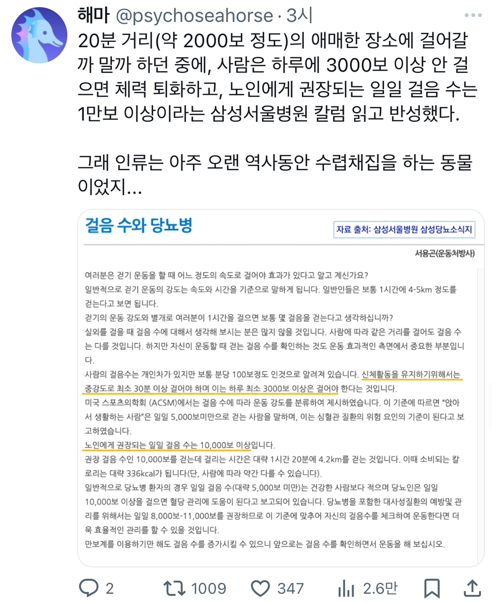 [스크랩] [흥미돋]20분 거리(약 2000보)의 애매한 장소에 걸어갈까 말까 하던 중에, 사람은 하루에 3000보 이상 안 걸으면 체력 퇴화하고.twt