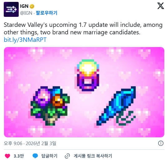 [흥미돋]스타듀밸리덬들 난리난 소식.twt 작성자귤토끼이|작성시간26.02.04|조회수16,925 목록 댓글 81 글자크기 작게가 글자크기 크게가 출처: https://theqoo.net/square/4083842943 https://x.com/IGN/status/2018657242774450272 결혼 가능 NPC 2명 추가된다고 함설렌다... 다음검색 현재 게시글 추가 기능 열기 북마크 공유하기 신고 센터로 신고 댓글 댓글 81 댓글쓰기 답글쓰기 댓글 리스트 작성자내 봄이려 | 작성시간 26.02.04 그 마법사랑 원래 결혼되나? 리텍하면 걔 잘생겼던데 작성자감자티김사랑단 | 작성시간 26.02.04 ㅈㅂ 수요없는 공급 말고 뉴캐… 작성자로롤롤루 | 작성시간 26.02.04 미 ㅣㄴ친 작성자배움을 갈구하는데유 | 작성시간 26.02.04 로빈이랑 샌디를 넣어 작성자채소쨥쨥 | 작성시간 26.02.05 아 시발 윌리랑 거스 전나 웃겨 댓글 전체보기