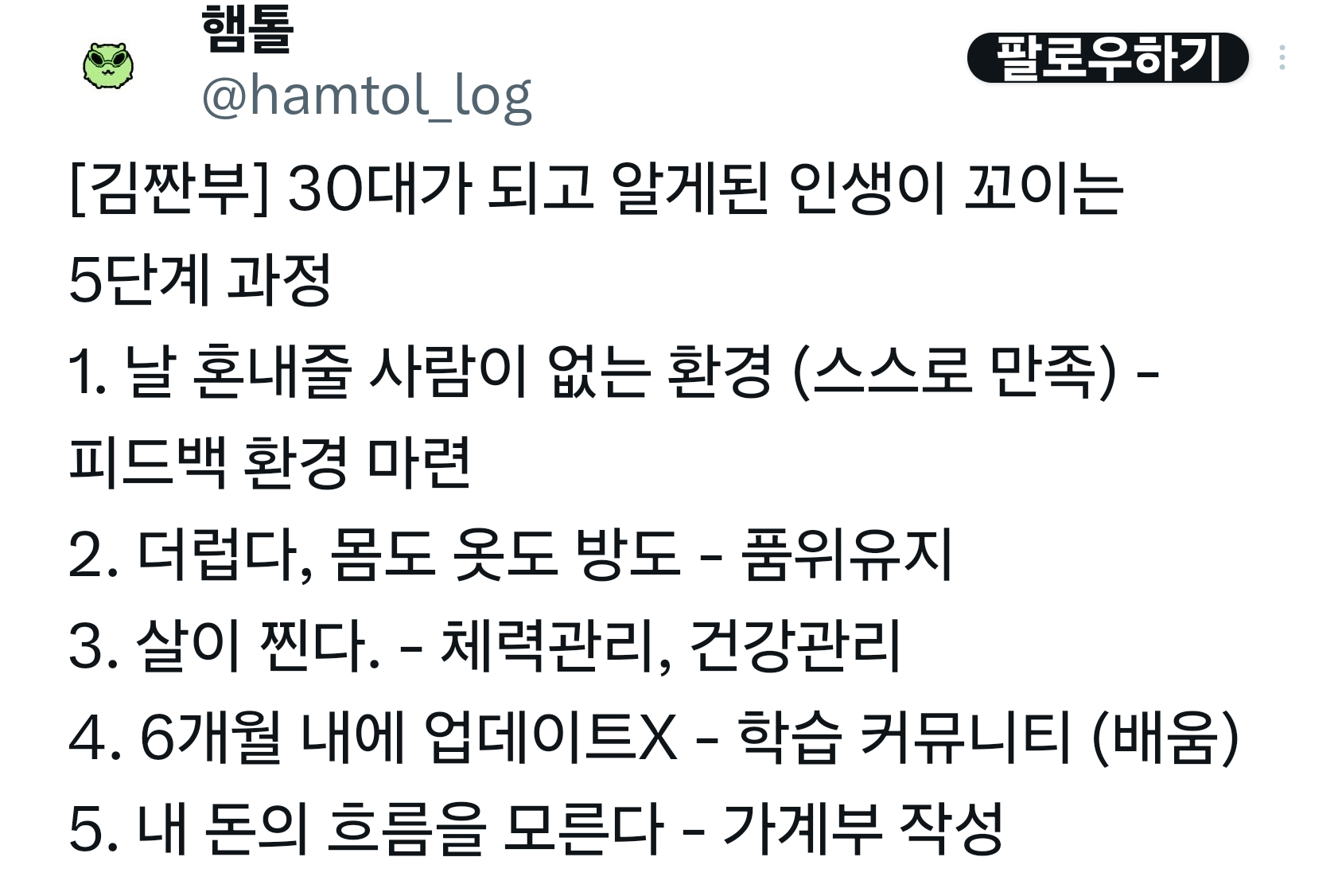 [스크랩] [흥미돋]30대가 되고 알게된 인생이 꼬이는 5단계 과정.twt 작성자다이소부자|작성시간26.02.04|조회수33,902 목록 댓글 13 글자크기 작게가 글자크기 크게가 출처 : https://www.dmitory.com/issue/309813076 ↓https://youtu.be/7Qt-jMFFfd4?si=6rJ24wlVm2bAj7tc 다음검색 스크랩 원문 : *여성시대* 차분한 20대들의 알흠다운 공간 현재 게시글 추가 기능 열기 북마크 공유하기 신고 센터로 신고 댓글 댓글 13 댓글쓰기 답글쓰기 댓글 리스트 답댓글 작성자긁 수저 | 작성시간 26.02.04 굳이 단편적으로 볼 필요 있으까?? 작성자Chloe | 작성시간 26.02.04 네 제가 꽈배깁니다 작성자이제야 돈 모으는 노답 | 작성시간 26.02.05 와 전부 다 여서 소름 작성자얼룩의탄생 | 작성시간 26.02.05 다 나야 작성자이킁에킁 | 작성시간 26.02.05 다 전데요...? ㅠㅠ 댓글 전체보기