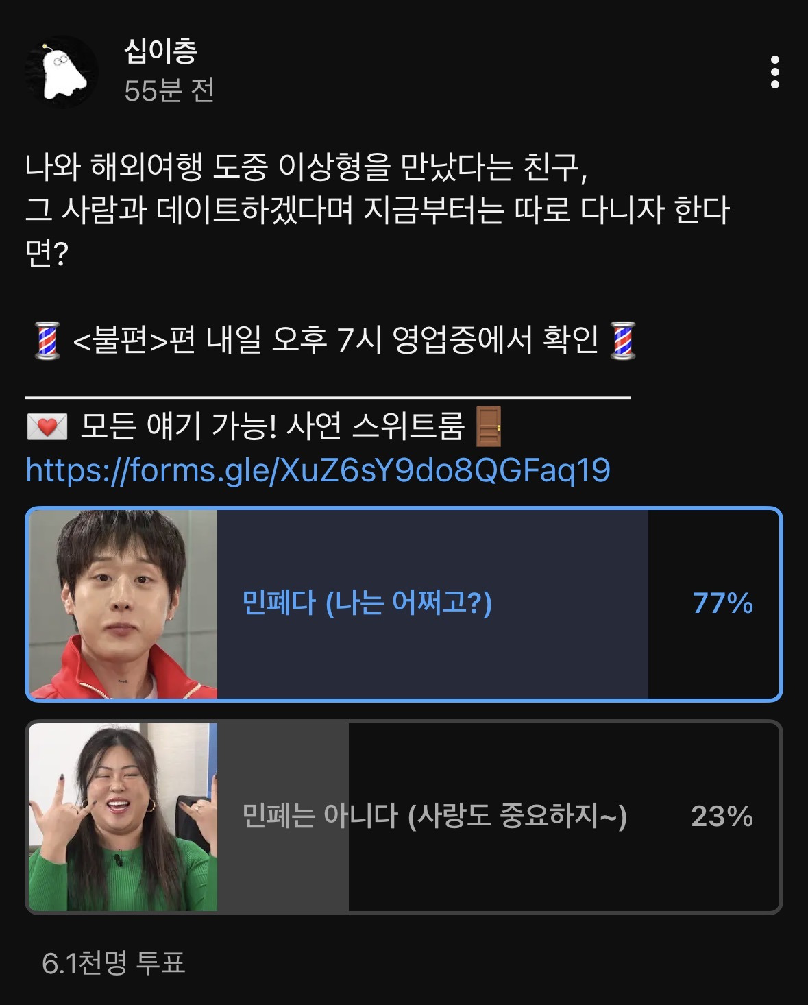 [흥미돋]실시간 6천명이 투표한 <해외여행 도중 이상형 만나서 따로 다니자는 친구 민폐다 VS 민폐는 아니다> 결과...jpg 작성자Sunmoonstar02|작성시간26.02.04|조회수19,445 목록 댓글 350 글자크기 작게가 글자크기 크게가 출처: https://www.dmitory.com/issue/399068940이슈/유머 - 실시간 6천명이 투표한 <해외여행 도중 이상형 만나서 따로 다니자는 친구 민폐다 VS 익명 정보 커뮤니티 사이트www.dmitory.com 다음검색 현재 게시글 추가 기능 열기 북마크 공유하기 신고 센터로 신고 댓글 댓글 350 댓글쓰기 답글쓰기 댓글 리스트 작성자대자유인 | 작성시간 26.02.05 민폐지;;; 작성자훔쳐온 고양이 | 작성시간 26.02.06 난 도파민돌아서 걍웃길듯ㅋㅋㅋㅋㅋㅋㅋㅋㅋㅋㅋㅋ 작성자가모라 | 작성시간 26.02.06 손절각인데 작성자잭퀘이드 | 작성시간 26.02.06 하루정도는 상관없음 혼자도 잘 놀아서 작성자코드쿤스트55 | 작성시간 26.02.06 ㅁㅍ 댓글 전체보기