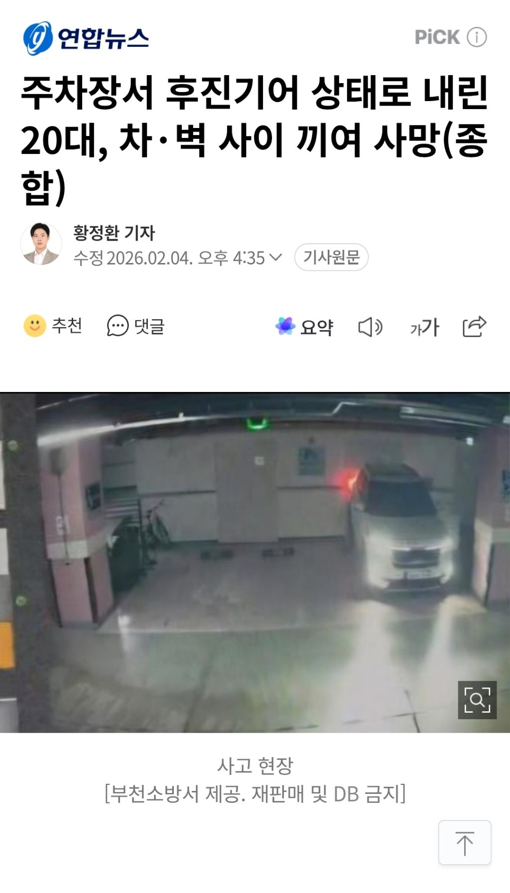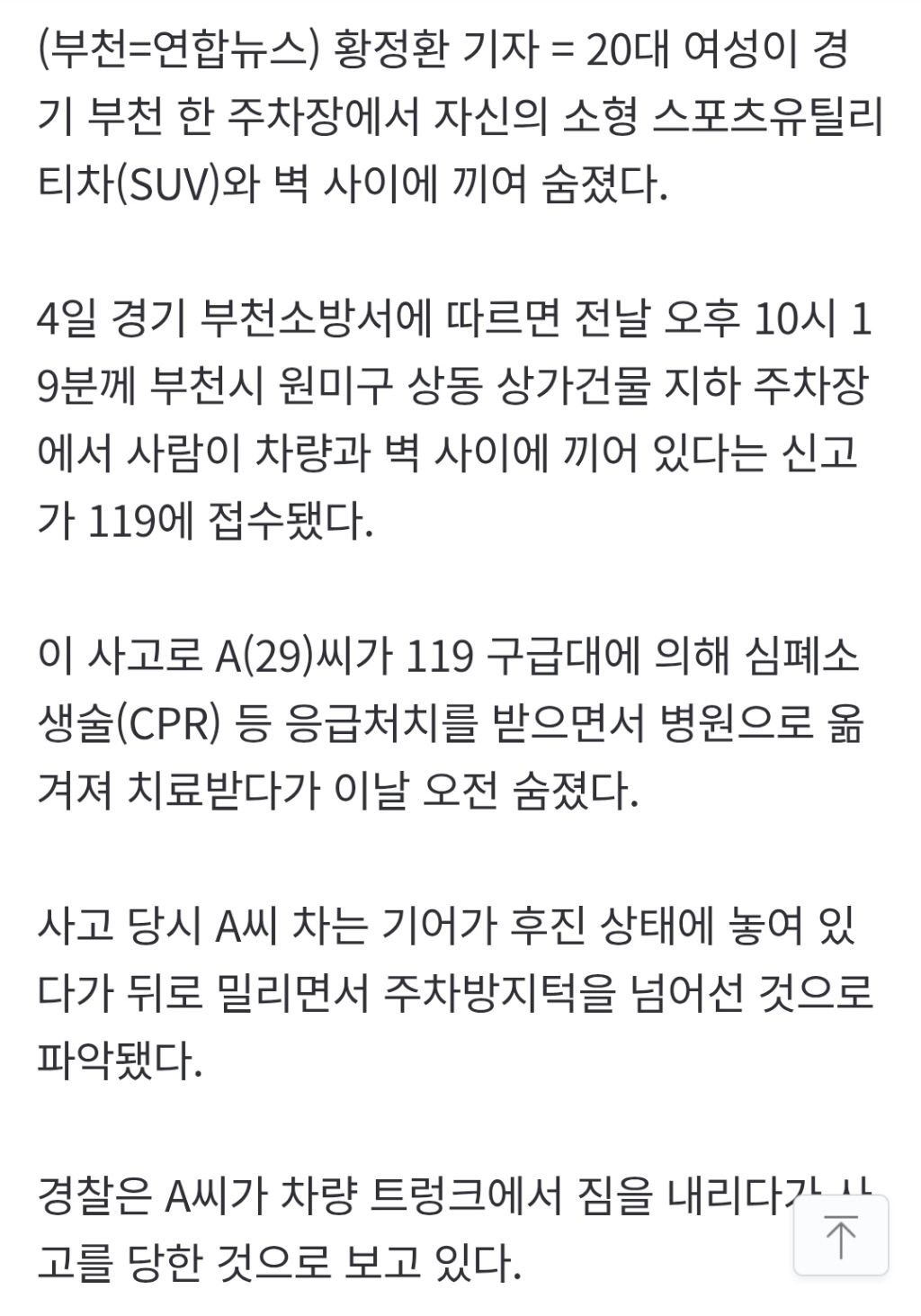 [여시뉴스데스크]주차장서 후진기어 상태로 내린 20대, 차•벽 사이 끼여 사망(종합) 작성자디스트리뷰젼|작성시간26.02.04|조회수55,748 목록 댓글 79 글자크기 작게가 글자크기 크게가 출처: https://n.news.naver.com/article/001/0015885474 다음검색 현재 게시글 추가 기능 열기 북마크 공유하기 신고 센터로 신고 댓글 댓글 79 댓글쓰기 답글쓰기 댓글 리스트 작성자파르나라 | 작성시간 26.02.05 삼가 고인의 명복을 빕니다 작성자후아유아후 | 작성시간 26.02.05 삼가 고인의 명복을 빕니다 작성자돌돌이 | 작성시간 26.02.05 삼가 고인의 명복을 빕니다 작성자돌치몰치 | 작성시간 26.02.05 삼가 고인의 명복을 빕니다 작성자프렌치불독 | 작성시간 26.02.05 삼가 고인의 명복을 빕니다 댓글 전체보기