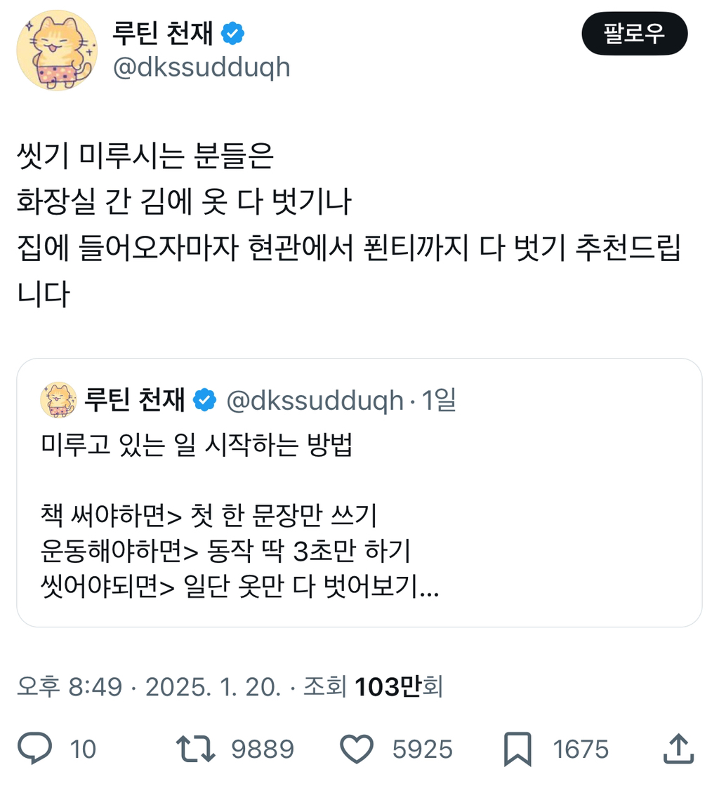 작성자안녕허손요 작성시간 26.02.04 씻기 싫을 때 걍 정수리에 물 냅다 묻혀,,, 옷도 안벗고 걍 샤워기틀어서 찬물로 정수리 물묻혔는데 바로 옷 벗고 샤워함