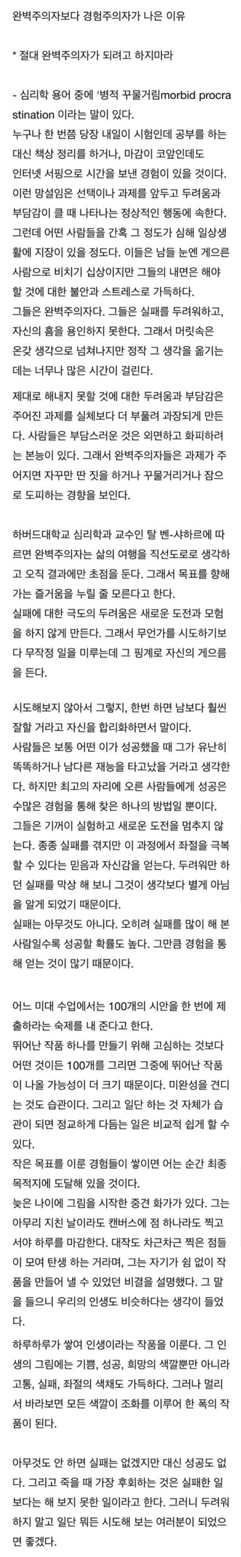 [스크랩] [흥미돋]절대 완벽주의자가 되려고 하지마라 작성자엥엥ㅇ|작성시간26.02.04|조회수7,741 목록 댓글 4 글자크기 작게가 글자크기 크게가 출처: 여성시대 모든게잘되기를빌 다음검색 스크랩 원문 : *여성시대* 차분한 20대들의 알흠다운 공간 현재 게시글 추가 기능 열기 북마크 공유하기 신고 센터로 신고 댓글 댓글 4 댓글쓰기 답글쓰기 댓글 리스트 작성자인조인간 | 작성시간 26.02.04 미완성을 견디는 것도 습관이다,, 넘 좋은 글이다 고마워 여샤!! 작성자다들힘내좋아좋내힘들다 | 작성시간 26.02.04 맞아 뼈에 새겨야지 작성자xnxbwkq | 작성시간 26.02.04 잘읽었어..! 저거원문 궁금하다..누가 쓰신걸까 작성자새끼고래 | 작성시간 26.02.04 좋은 글 고맙다. 댓글 전체보기