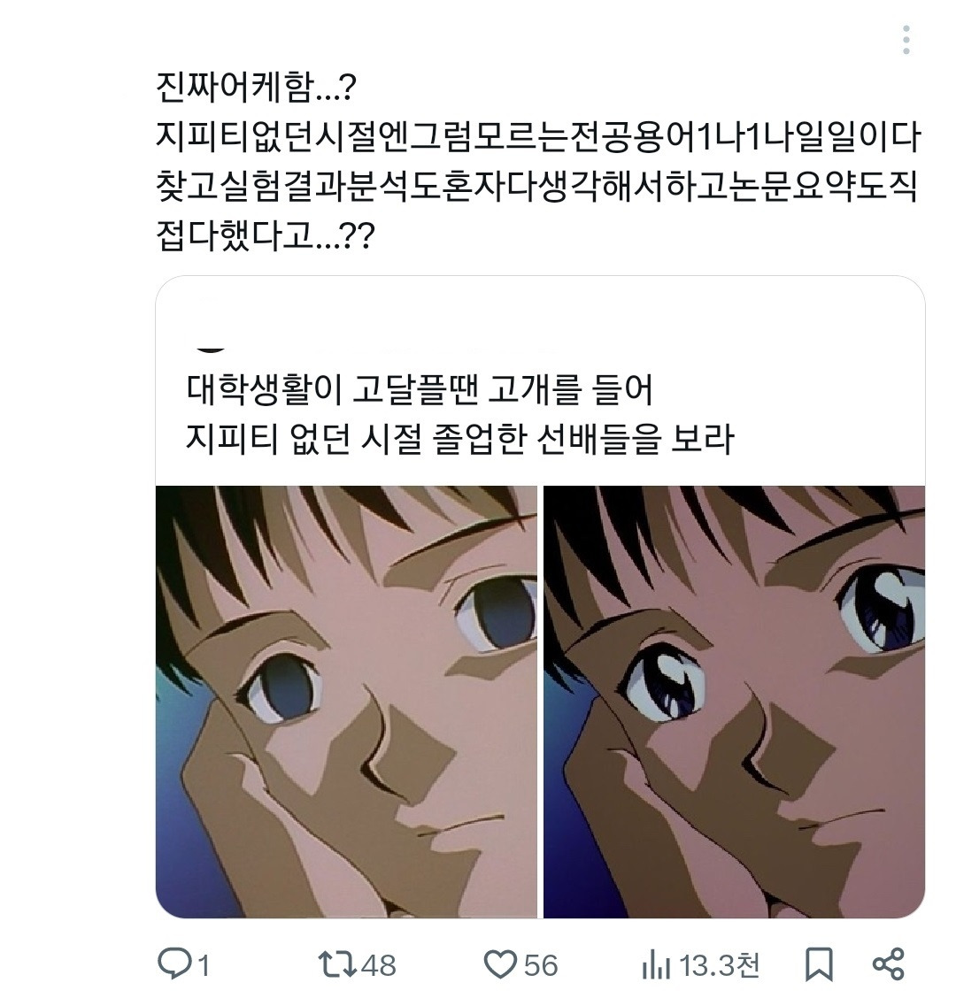 [흥미돋]요즘 대학생들 : AI가 없던 시절에는 그럼 대학생활을 대체 어케 하신거에요 선배님들...... 작성자지9별|작성시간26.02.05|조회수86,864 목록 댓글 238 글자크기 작게가 글자크기 크게가 출처: https://theqoo.net/square/4084420232 다음검색 현재 게시글 추가 기능 열기 북마크 공유하기 신고 센터로 신고 댓글 댓글 238 댓글쓰기 답글쓰기 댓글 리스트 작성자두잉둥 | 작성시간 26.02.06 구글링은 사람들 다 똑같이쓸것같아서 책 쌓아두고 레포트쓰면 성적 높게나왔어ㅋㅋㅋ근데 책 찾아보는 맛이 있어 대학생 청춘 너낌이랄까요,, 작성자고구마고구마 | 작성시간 26.02.06 ㄹㅇ 도서관 간적많음 자료가없어서 작성자치즈볼존맛탱구리 | 작성시간 26.02.06 논문보고 쓰죠 작성자티테 | 작성시간 26.02.06 riss와 도서관 서적... 작성자세일러 코스모스 | 작성시간 26.02.15 그래 댓글 전체보기