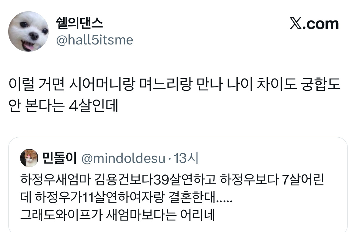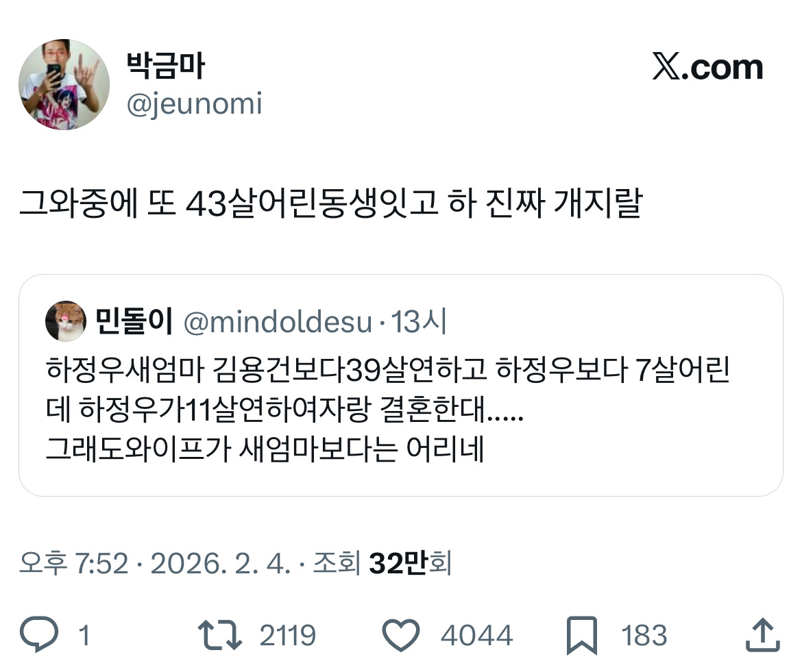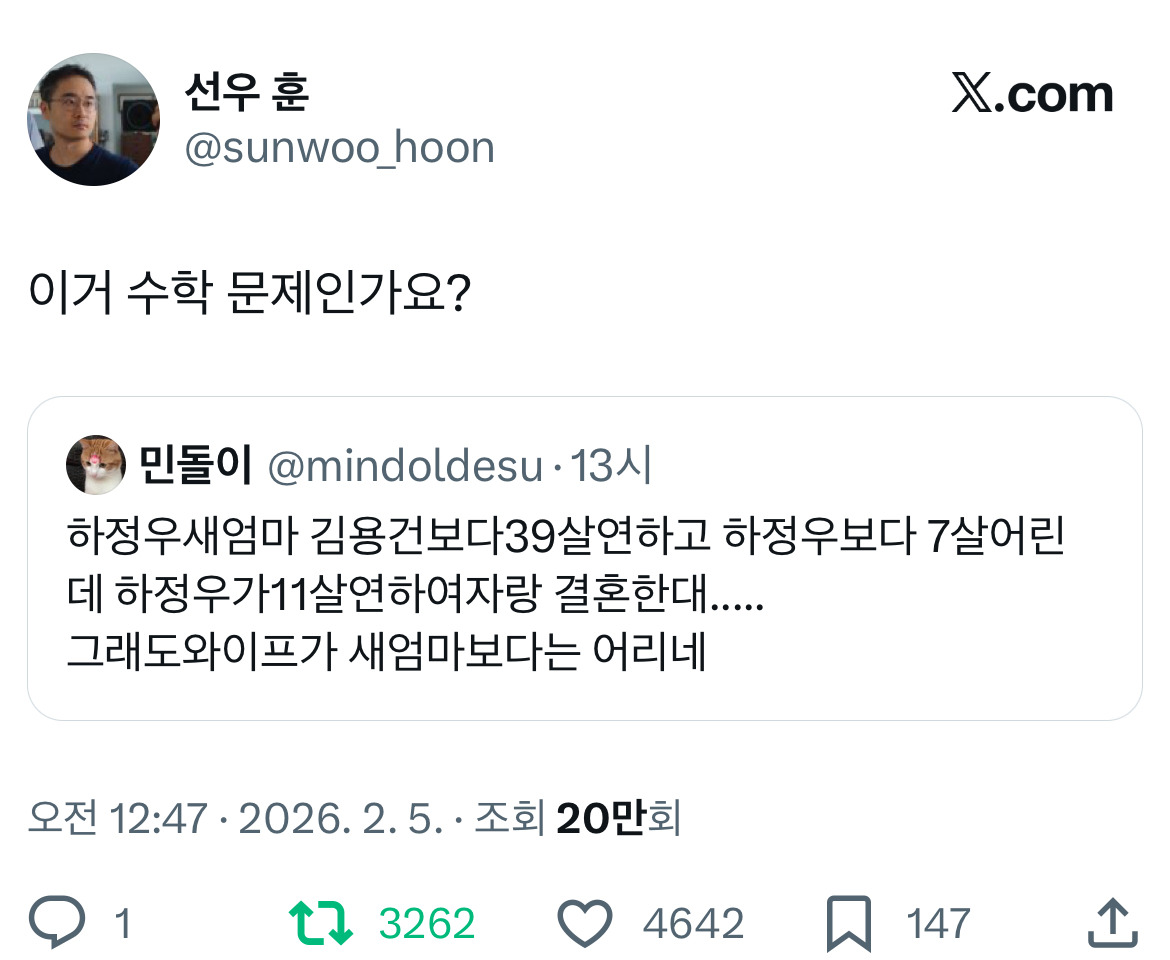 [흥미돋]이거 수학 문제인가요?.twt 작성자Egypt|작성시간26.02.05|조회수9,630 목록 댓글 14 글자크기 작게가 글자크기 크게가 출처: https://x.com/sunwoo_hoon/status/2019075248902279644?s=46 개Tmi 김용건이랑 아이콘 바비랑 49살 차이나는데자식 나이는 똑가틈 다음검색 현재 게시글 추가 기능 열기 북마크 공유하기 신고 센터로 신고 댓글 댓글 14 댓글쓰기 답글쓰기 댓글 리스트 작성자슈퍼스타블루닷 | 작성시간 26.02.05 와우... 작성자damiano david | 작성시간 26.02.05 ㅋㅋㅋㅋㅋㅋㅋㅋㅋㅋ수학 문제 작성자카스 프레쉬 | 작성시간 26.02.05 하정우 새엄마가 하정우보다 7살 어리다고...?????? 작성자TESIS | 작성시간 26.02.05 구라길 차라리 수학문제길 ㅅㅂ 작성자주민진 | 작성시간 26.02.05 아나 아이콘 바비랑 자식나이같음 개웃기네(안웃겨 댓글 전체보기