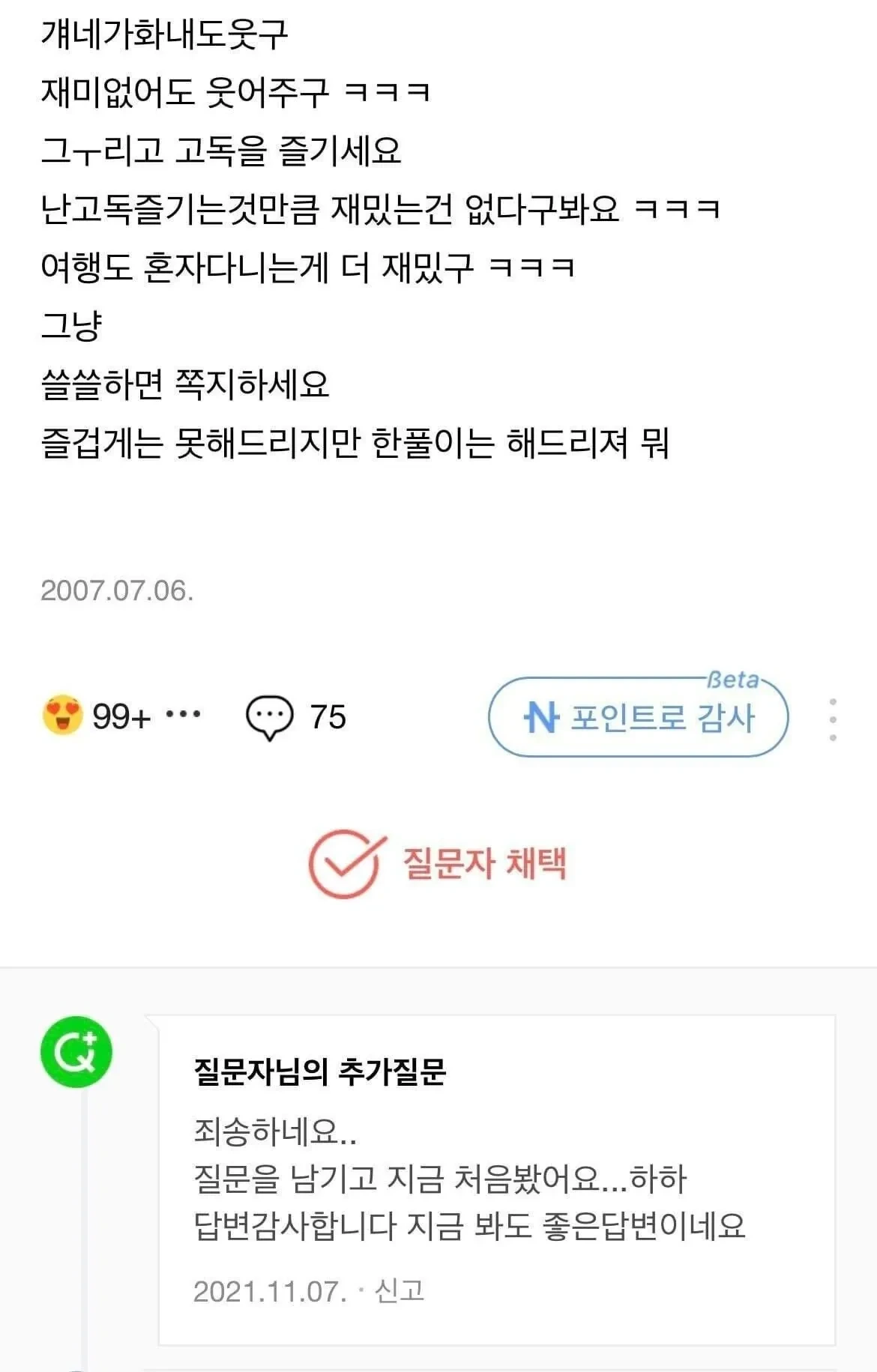 [스크랩] [흥미돋]14년이 지나서야 채택 된 네이버 지식인 답변 작성자에어컨파워냉방으로틀어|작성시간26.02.05|조회수52,704 목록 댓글 30 글자크기 작게가 글자크기 크게가 다음검색 스크랩 원문 : 쭉빵카페 현재 게시글 추가 기능 열기 북마크 공유하기 신고 센터로 신고 댓글 댓글 30 댓글쓰기 답글쓰기 댓글 리스트 작성자노으을 | 작성시간 26.02.05 이글 볼때마다 좋아 ㅎㅎ 작성자여자들아 기죽지마라 | 작성시간 26.02.05 눈물나 ㅜㅜ 넘 따숩다 작성자쏨땀땀쏨 | 작성시간 26.02.05 울컥하네ㅠㅠ 작성자머이런걸다 | 작성시간 26.02.06 진짜 낭만있다.... 저 시절이 그립고 잊지못할 추억을 남긴 저 사람들이 부럽네 ㅜ 작성자정수정수정이 | 작성시간 26.02.22 낭만 그 자체다 종종 생각날 듯… 댓글 전체보기