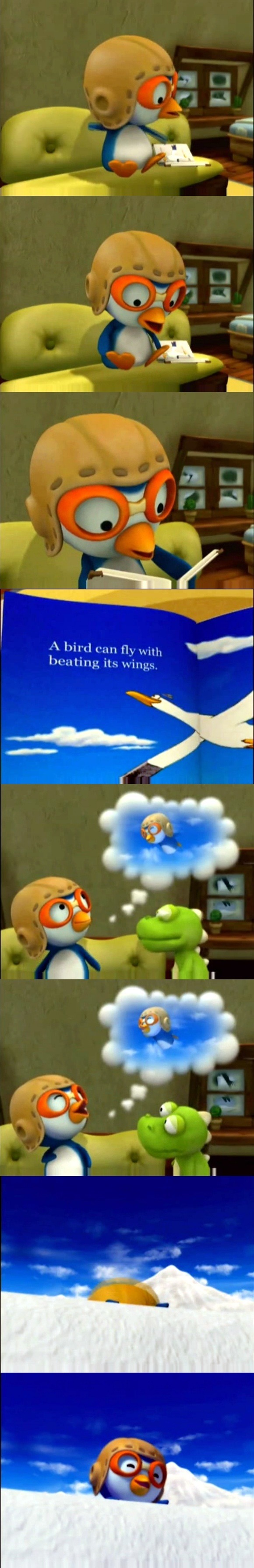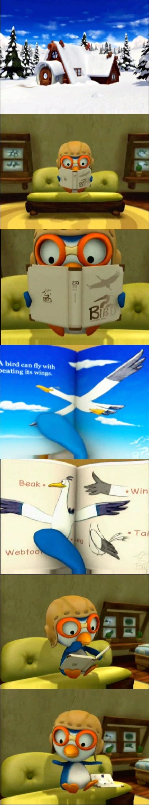 뽀로로 자신도 책속에 있는 새처럼 부리와 날개가있으니 당연히 하늘을 날 수 있을꺼라는 기대를 가지게 된다.