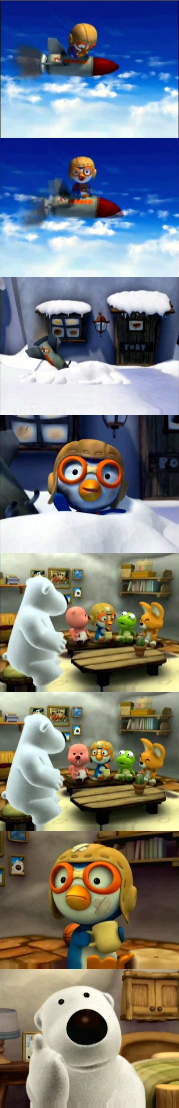 하지만 뽀로로는 거듭되는 실패에 상처투성이가 되고