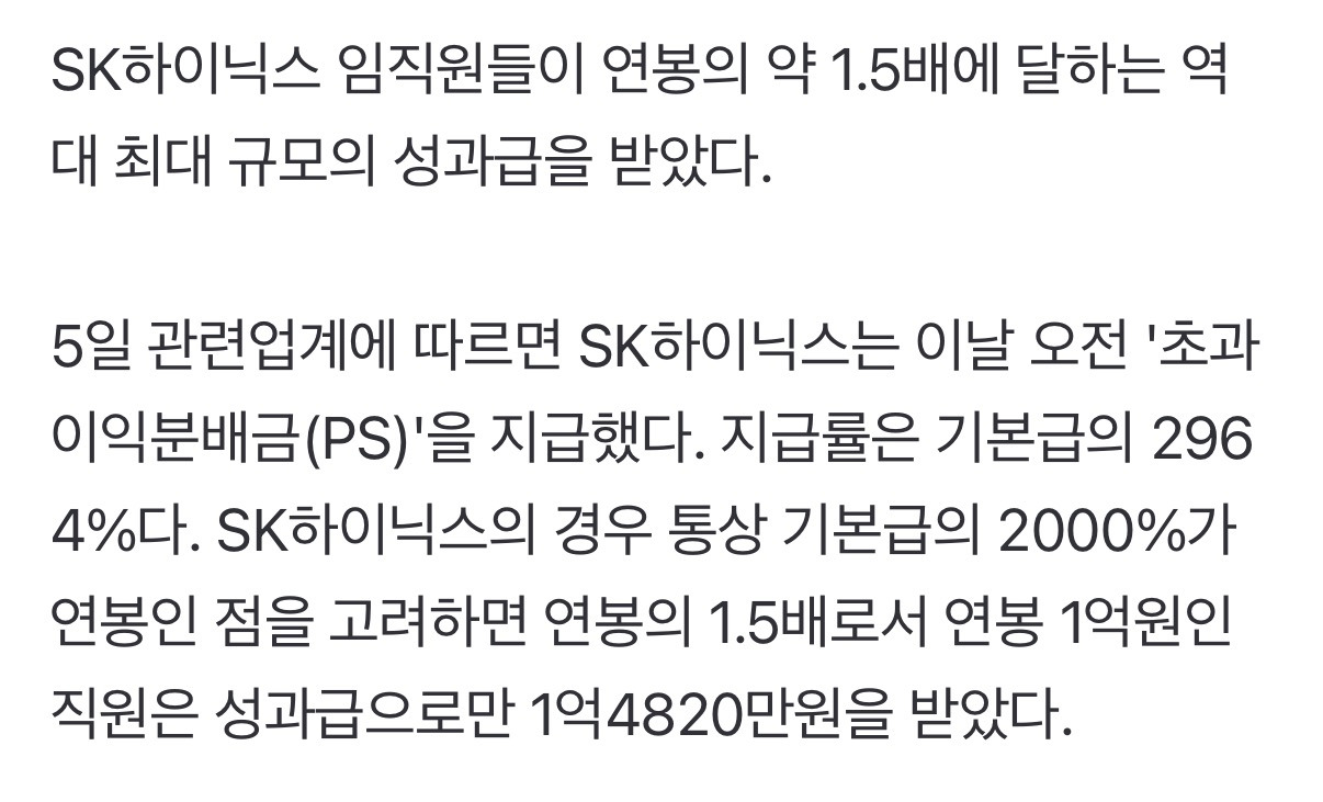 [여시뉴스데스크]"연봉 1억, 보너스는 1.5억"...SK하이닉스 성과급, 오늘 통장에 꽂혔다 작성자죽덕후|작성시간26.02.05|조회수27,539 목록 댓글 243 글자크기 작게가 글자크기 크게가 출처: https://naver.me/FfsNnHzS(서울=뉴스1) 이호윤 기자 = 3일 서울 중구 우리은행 본점 딜링룸 전광판에 SK하이닉스 종가가 표시되고 있다. 이날 SK하이닉스 주가는 전 거래일 대비 77,000원(9.28%) 상승한 907,000원에 마감했다. 전문 출처로1월 30일 PI 한바가지, 오늘 PS 한바가지 통장에 꽂힘 다음검색 현재 게시글 추가 기능 열기 북마크 공유하기 신고 센터로 신고 댓글 댓글 243 댓글쓰기 답글쓰기 댓글 리스트 작성자김병관 | 작성시간 26.02.06 직원들 사기진작 되겠다 작성자쿠링이 | 작성시간 26.02.06 일년에 이억..? 작성자일렉기타 | 작성시간 26.02.06 서민통 ㅅㅂ... 작성자박보람 | 작성시간 26.02.07 1억......대박 모으려고하지않아도 벌수가있는돈이네 작성자공기청정선풍기 | 작성시간 26.02.07 하..개부럽다진짜미쳤다 댓글 전체보기