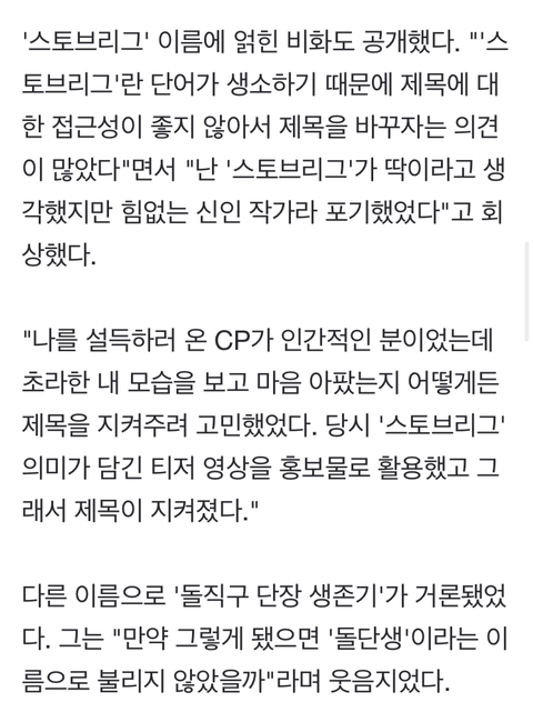 [스크랩] [흥미돋]드라마 스토브리그 제목이 어렵다고 바껴서 나올뻔한 제목명 작성자INFP수집가|작성시간26.02.05|조회수14,682 목록 댓글 37 글자크기 작게가 글자크기 크게가 출처 : 여성시대 keephttps://m.cafe.daum.net/subdued20club/ReHf/2899403드라마 스토브리그 제목이 어렵다고 바껴서 나올뻔한 제목명출처 : 여성시대 파워포인트엑셀돌단생m.cafe.daum.net(스크랩 안 돼서 새글로 퍼옴)돌직구 단장 생존기ㅋㅋㅋㅋㅋㅋㅋ 다음검색 스크랩 원문 : *여성시대* 차분한 20대들의 알흠다운 공간 현재 게시글 추가 기능 열기 북마크 공유하기 신고 센터로 신고 댓글 댓글 37 댓글쓰기 답글쓰기 댓글 리스트 작성자GIANTS | 작성시간 26.02.05 ㅅㅂ...개밤티 작성자배달의만족 | 작성시간 26.02.05 천원짜리 변호사가 잠입하는 것 같잖아욧 작성자컨텍스트 | 작성시간 26.02.05 으악ㅋㅋㅋㅋㅋㅋㅋㅋㅋㅋㅋㅋㅋㅋㅋ 작성자our new celebrity | 작성시간 26.02.05 그럼 백승수가 아니라 김성룡이 와야지ㅋㅋ글고 돌단생이면 난 안 봤음ㅋㅋㅋㅋ 작성자보로봉붕 | 작성시간 26.02.05 초라한 내모습ㅋㅋㅋㅋㅋㅋ 댓글 전체보기