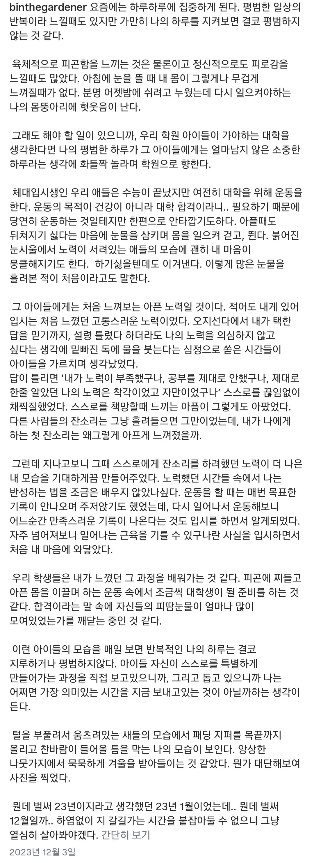 [흥미돋]임용 합격한 환승연애2 원빈 작성자딸기알맹이|작성시간26.02.05|조회수129,604 목록 댓글 211 글자크기 작게가 글자크기 크게가 출처: https://theqoo.net/square/4084871207중앙대 체교과 나왔고 환연2 출연도 첨에 공부 땜에 고사했다 했었음 ㅊㅋㅊㅋ 다음검색 현재 게시글 추가 기능 열기 북마크 공유하기 신고 센터로 신고 댓글 댓글 211 댓글쓰기 답글쓰기 댓글 리스트 작성자수박과나 | 작성시간 26.02.06 헐 근데 교사되면 교육관련활동빼고 겸직불가인데 인플활동은 접으려나..? 작성자잘되는 건 확정이고 걍 시간문제ㅋ | 작성시간 26.02.06 멋지다 작성자말두돼돼 | 작성시간 26.02.06 아 화분에 물주러가라는거 조오온나 웃기다 ㅋㅋㅋㅋ 작성자수수니니 | 작성시간 26.02.07 멋지다~~~ 작성자다우니좋아 | 작성시간 26.02.14 ㅊㅋㅊㅋ 댓글 전체보기