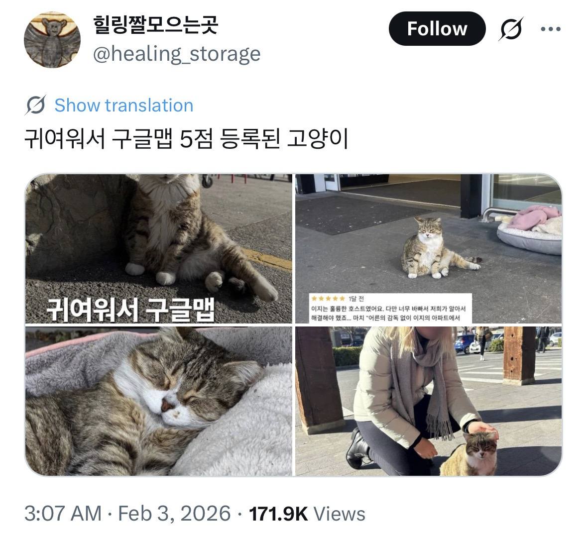 [스크랩] [흥미돋]귀여워서 구글맵 5점 등록된 고양이.twt 작성자fall for me|작성시간26.02.05|조회수21,322 목록 댓글 6 글자크기 작게가 글자크기 크게가 출처: https://x.com/healing_storage/status/2018642485917225194?s=20X의 힐링짤모으는곳님(@healing_storage)귀여워서 구글맵 5점 등록된 고양이x.com 다음검색 스크랩 원문 : *여성시대* 차분한 20대들의 알흠다운 공간 현재 게시글 추가 기능 열기 북마크 공유하기 신고 센터로 신고 댓글 댓글 6 댓글쓰기 답글쓰기 댓글 리스트 작성자윤해서 | 작성시간 26.02.05 하... 사랑해 작성자스캭피 | 작성시간 26.02.05 하 귀엽다ㅠㅠ 해치는 사람 없이 많은 사람들의 사랑 받으면서 사는 길생명들이 많아졌으면 좋겠어 작성자일단고 | 작성시간 26.02.05 하... 귀여워 작성자후둥이 | 작성시간 26.02.05 너무 귀엽고 좋다 우리나라였으면 민원들어가고 난리났을건데 작성자쿠키런킹 | 작성시간 26.02.05 나쁜 인간들 없었으면 좋겠다.. 댓글 전체보기