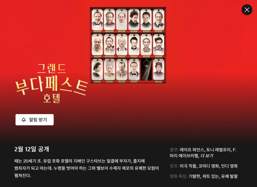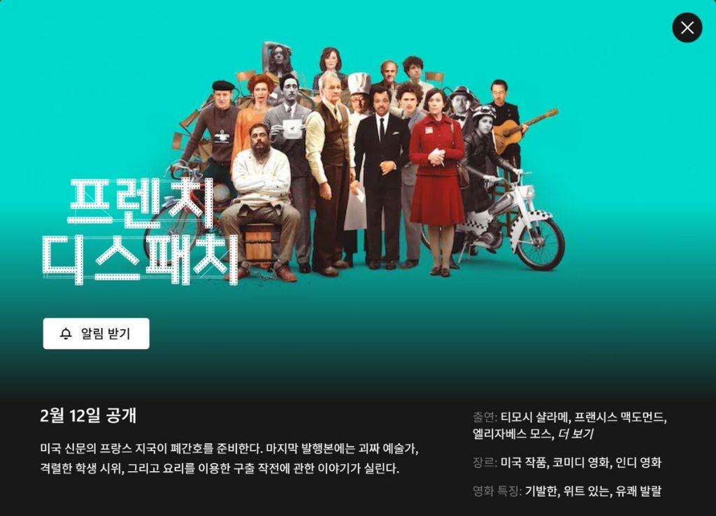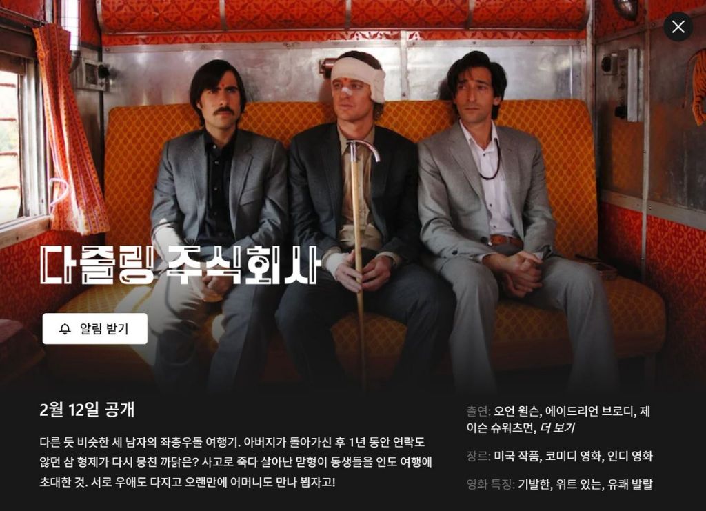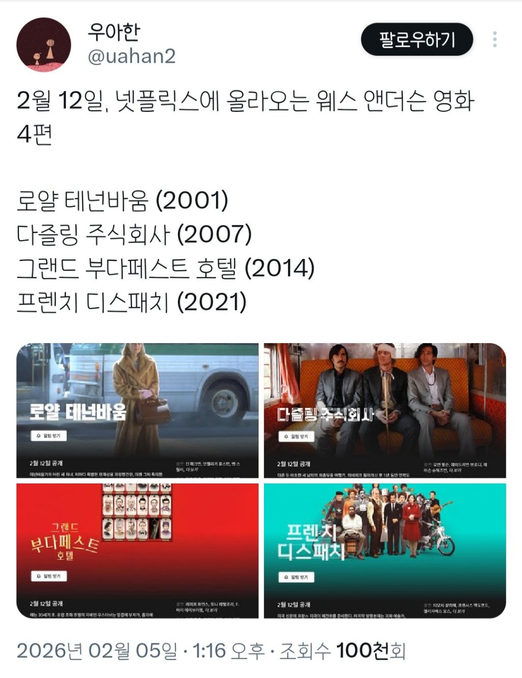 [흥미돋]넷플에 올라오는 웨스 앤더슨 영화 4편 작성자바밤바봉다리|작성시간26.02.05|조회수8,365 목록 댓글 12 글자크기 작게가 글자크기 크게가 출처:https://x.com/i/status/2019263883199045635X의 우아한님(@uahan2)2월 12일, 넷플릭스에 올라오는 웨스 앤더슨 영화 4편 로얄 테넌바움 (2001) 다즐링 주식회사 (2007) 그랜드 부다페스트 호텔 (2014) 프렌치 디스패치 (2021)x.com2월 12일 업로드 예정 다음검색 현재 게시글 추가 기능 열기 북마크 공유하기 신고 센터로 신고 댓글 댓글 12 댓글쓰기 답글쓰기 댓글 리스트 작성자바다 한 조각 | 작성시간 26.02.05 오오 오랜만에 다질링 주식회사 오랜만에 다시 보고싶었는데 굿타이밍 작성자구태 | 작성시간 26.02.05 로얄테넘바움 최애ㅜㅜ 작성자오잉또잉뾰잉 | 작성시간 26.02.05 봐야겟군 작성자sodwkdrh | 작성시간 26.02.05 오 작성자옴마니반메엥? | 작성시간 26.02.06 그랜드부다페스트 ㅠㅠㅠㅠㅠ드디어 ㅠㅠㅠ 댓글 전체보기