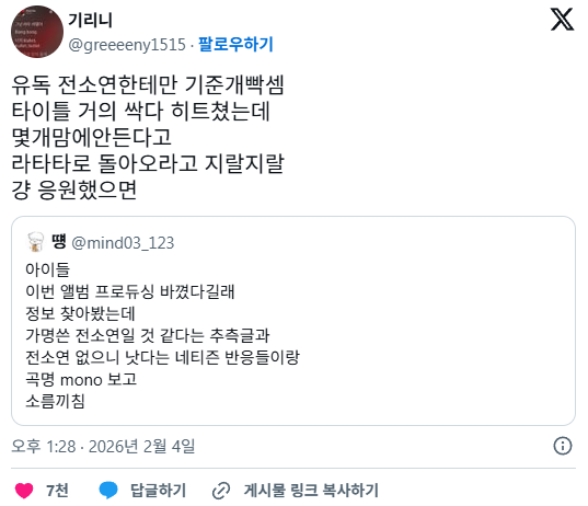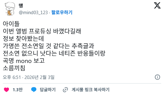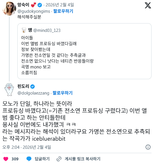 작성자ROWKY 작성시간 26.02.05 팬들사이에서는 아이스블루래빗 = 전소연 민니 우기 아니냐는 말도 돌긴하더라