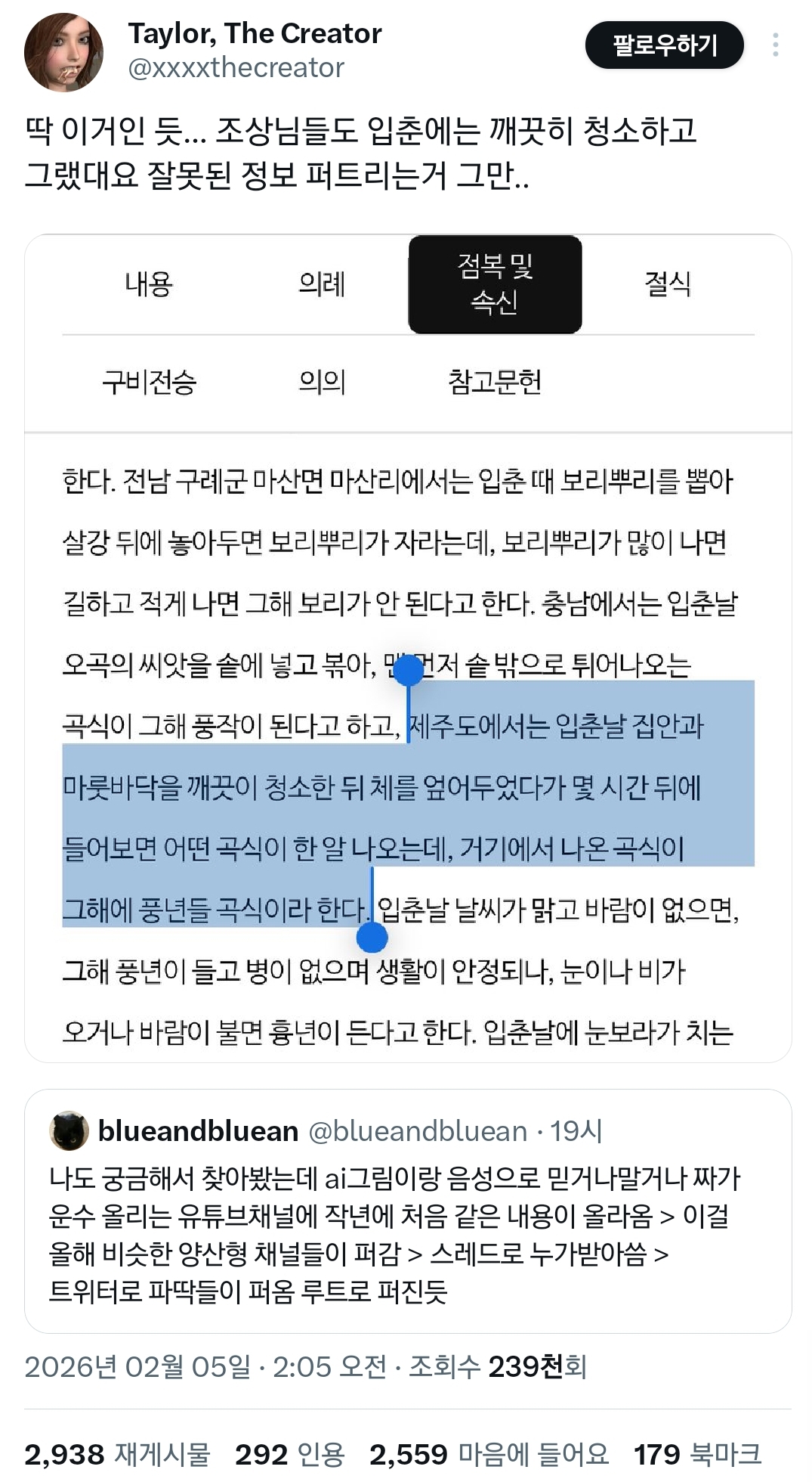 며칠 전 쓰레드, 트위터에 올라온 '입춘에 하면 안 되는 행동' 글들이 보임