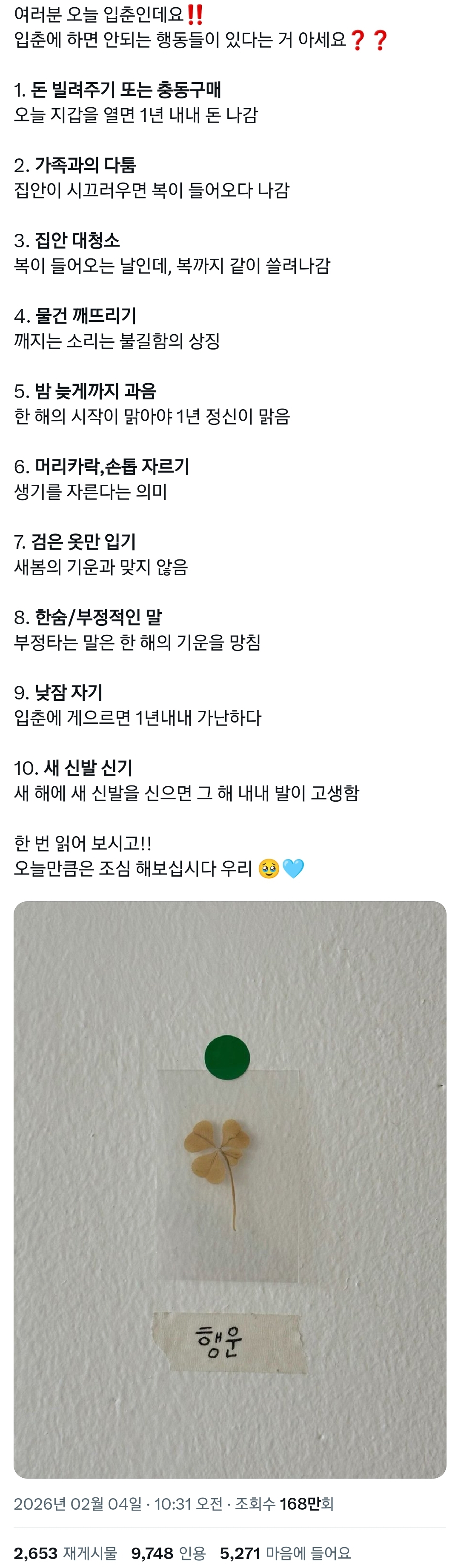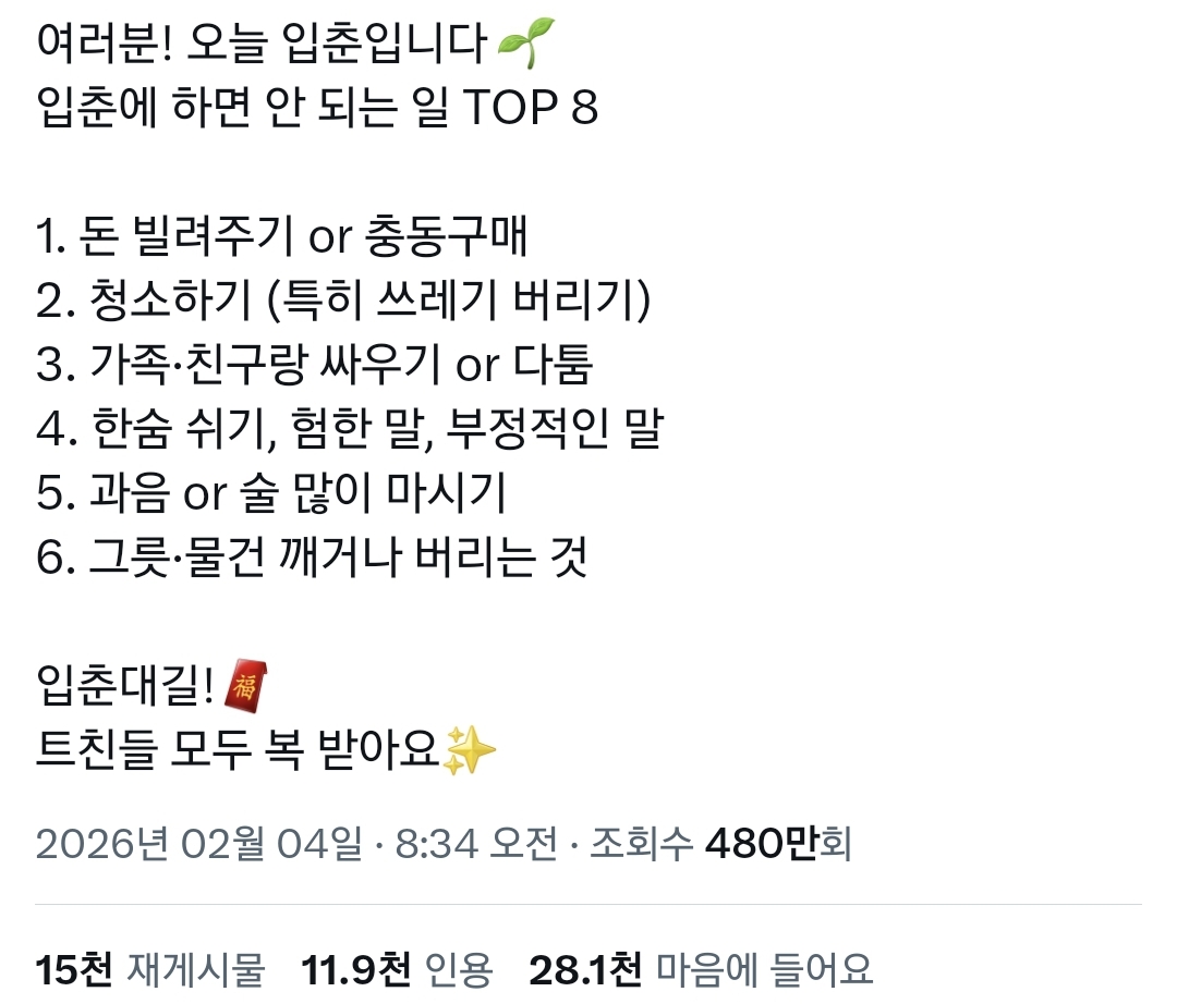 어제 sns 및 커뮤에 돌았던 입춘에 하면 안 되는 일 목록
