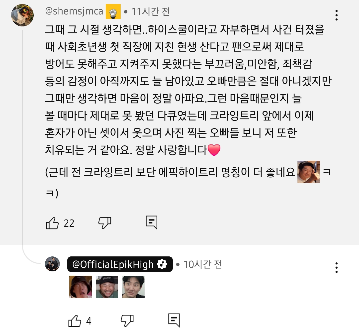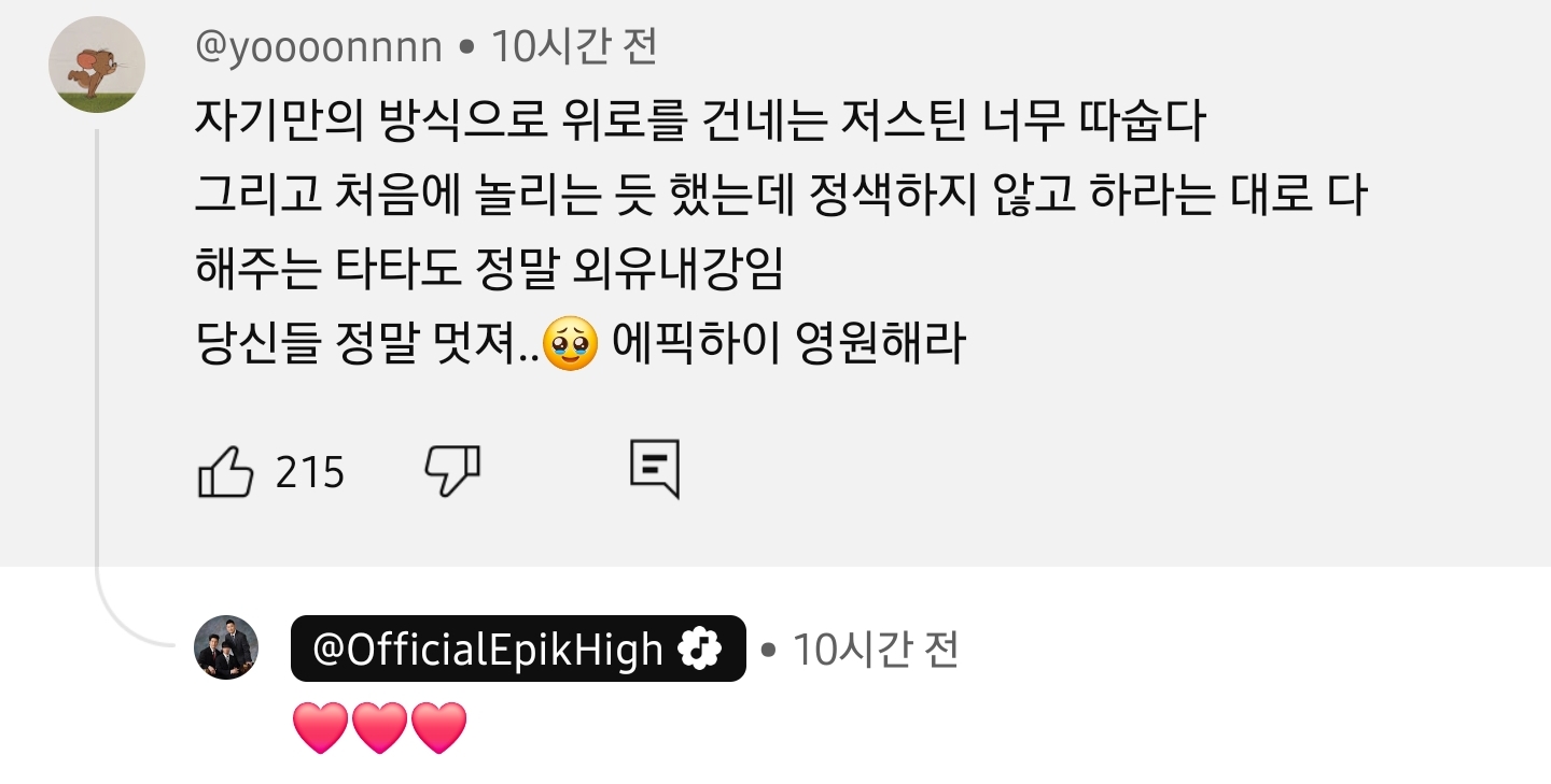 작성자귀여운게좋음 작성시간 26.02.06 이 편보고 울었음ㅠ 이게 캡쳐에 다 안담겼는데 투컷이랑 미쓰라가 진짜로 타블로 위로해주려는게 느껴졌음ㅠㅠㅠㅠ 하필 타이밍도 멤버들 군대갔을때 그러냐고ㅠ