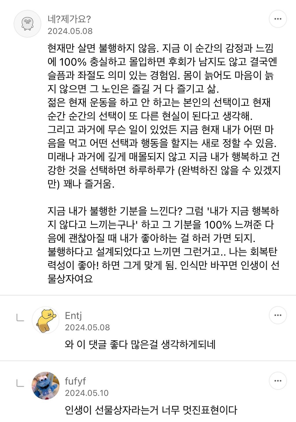 작성자나의사춘기에게 작성시간 26.02.06 난 미래를 고민하고 과거를 후회해서 불행한거같애 맛있는걸 먹고 하고싶은걸 하는 현재를 행복해해야 하는데 행복해하면서도 불행해ㅠ너무 좋은말이야