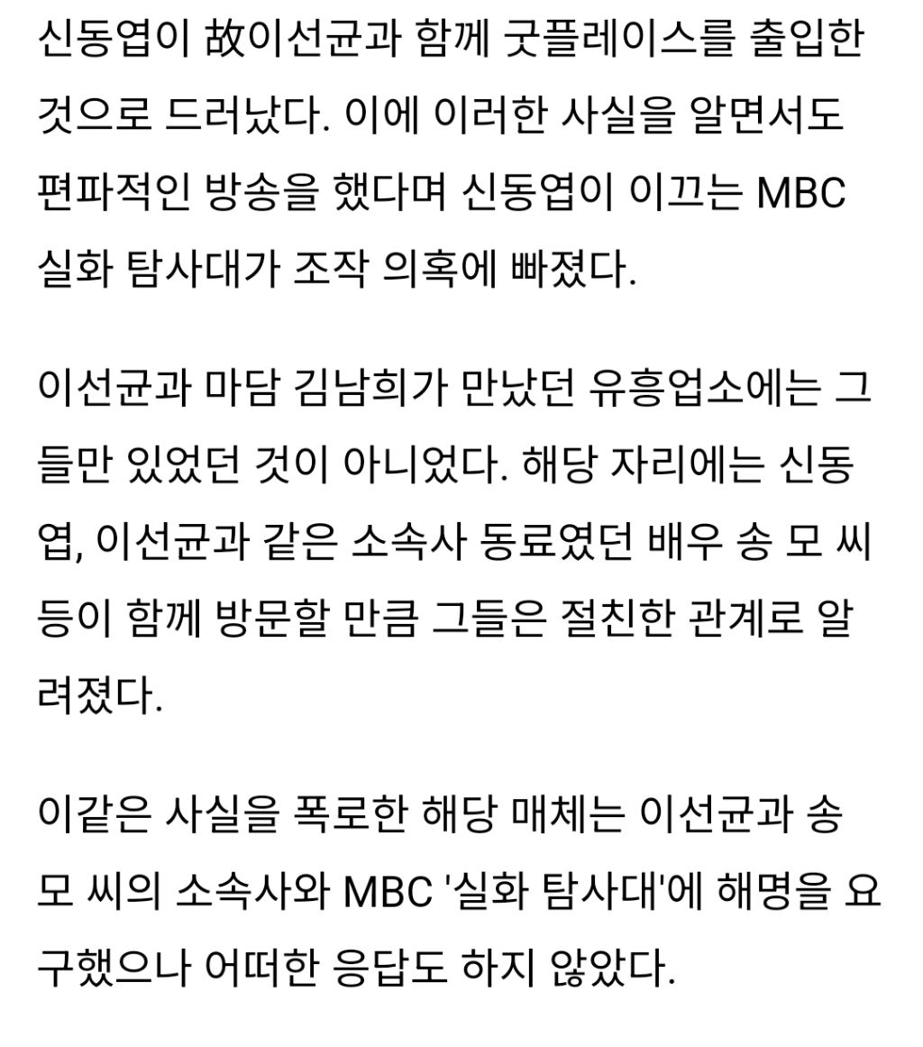 [스크랩] [여시뉴스데스크]"본인만 쏙 빼고 이선균만 보도"... 신동엽, 故이선균과 함께 굿플레이스 출입... 'MBC 실화 탐사대' 조작 의혹 작성자산딸기에이드|작성시간26.02.06|조회수27,170 목록 댓글 84 글자크기 작게가 글자크기 크게가 출처: 여성시대 (https://naver.me/xJGMCa8T) 다음검색 스크랩 원문 : *여성시대* 차분한 20대들의 알흠다운 공간 현재 게시글 추가 기능 열기 북마크 공유하기 신고 센터로 신고 댓글 댓글 84 댓글쓰기 답글쓰기 댓글 리스트 작성자우유사탕 | 작성시간 26.02.06 웩스바리 왜 묻히는건데 작성자프레디하이모어 | 작성시간 26.02.06 이게진짜라면 진짜... 이건아니야..... 작성자이재명 건들면 대가리 콱 깨버려 | 작성시간 26.02.06 여태 나오고 있는거 보면 뭔가 확실한 뒷배가 있나봐 작성자영앤리치치리뱅뱡 | 작성시간 26.02.06 논란 안되는게 졸라 신기함 작성자롸와롸라 | 작성시간 26.02.06 구웨엑 댓글 전체보기