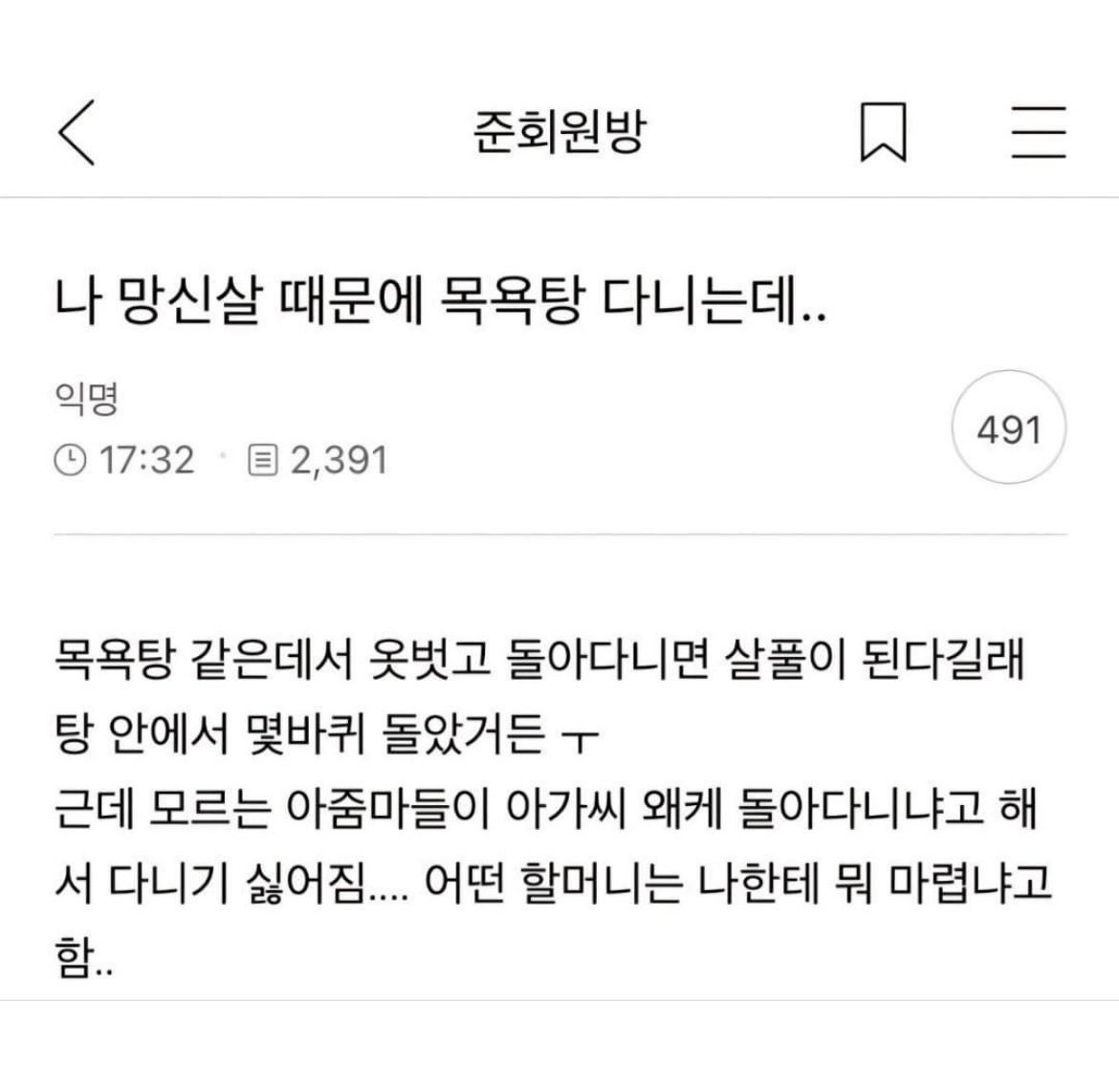 작성자AsIam 작성시간 26.02.06 아 탕 안에서 ㅋㅋㅋㅋ 요즘 목욕탕에 어르신들도 웬만해선 모르는 사람한테 말 안거시는데 ㅋㅋㅋㅋㅋ 탕 안에서 그랬으면 나라도 말 걸듯 ㅋㅋㅋㅋㅋ