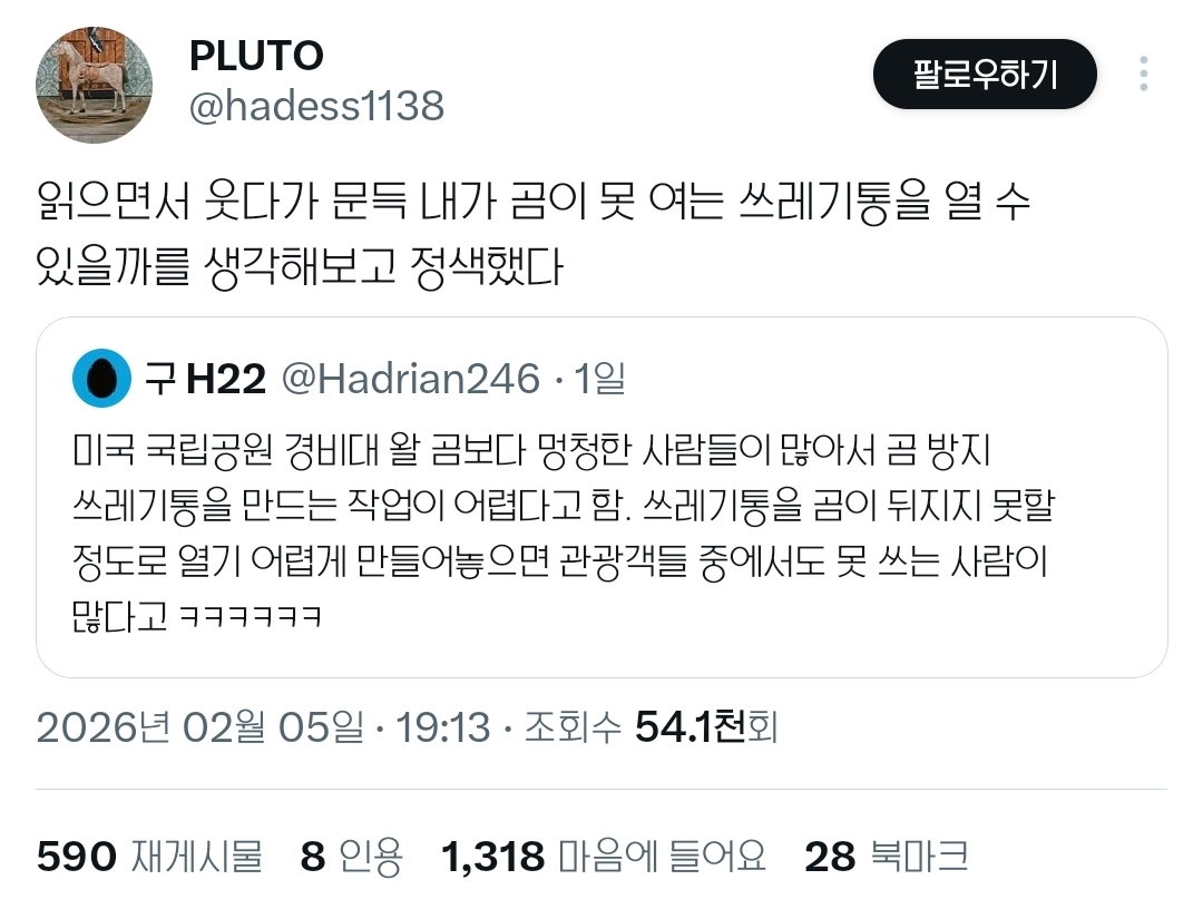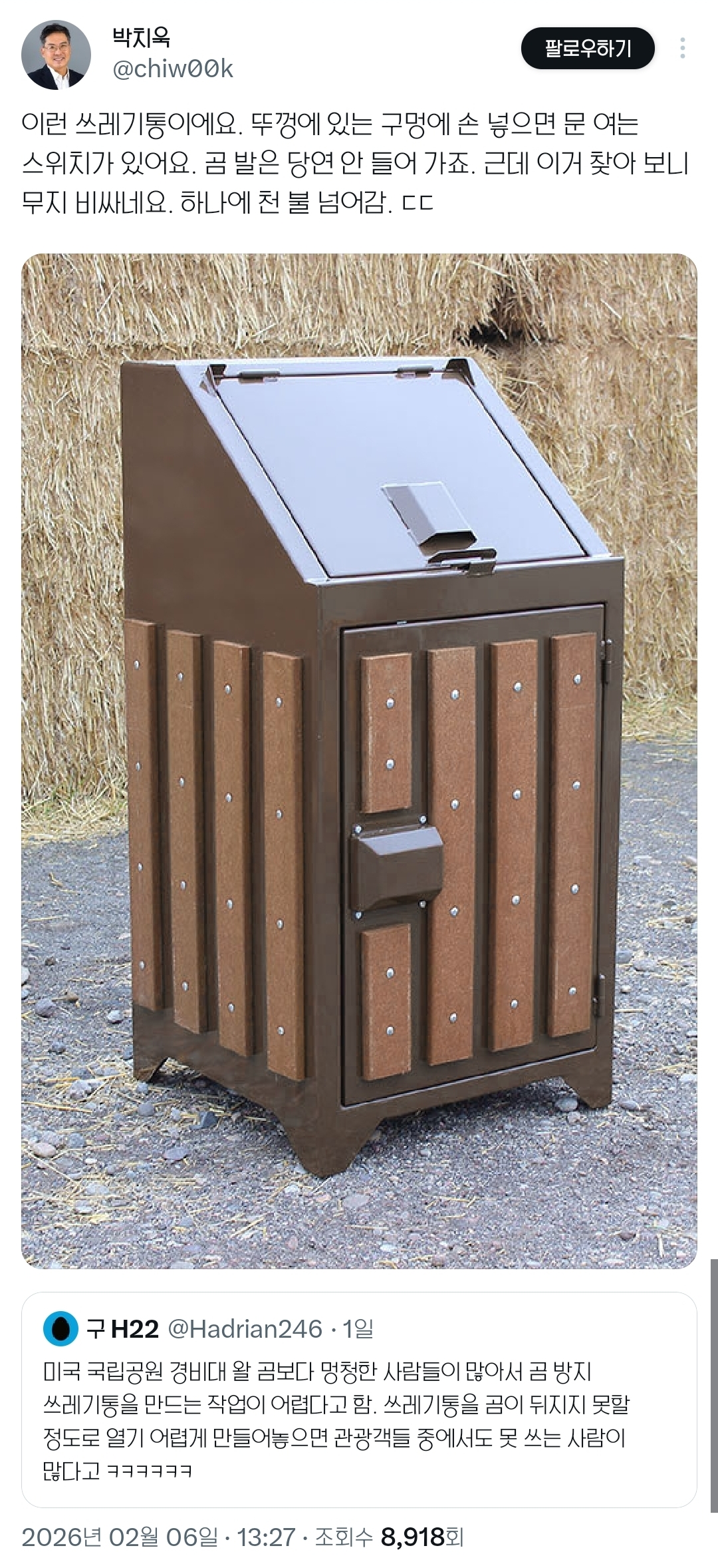[흥미돋]싱기방기 미국 국립공원의 곰 방지 쓰레기통.twt 작성자카이지|작성시간26.02.06|조회수34,415 목록 댓글 11 글자크기 작게가 글자크기 크게가 출처: https://x.com/i/status/2019267679283265766https://x.com/i/status/2019267679283265766https://x.com/i/status/2019353664369094709https://x.com/i/status/2019629105084498331 다음검색 현재 게시글 추가 기능 열기 북마크 공유하기 신고 센터로 신고 댓글 댓글 11 댓글쓰기 답글쓰기 댓글 리스트 작성자모닝글로리볶음 | 작성시간 26.02.06 미국은... 뭔가 저기에 주삿바늘 숨겨놓고 그럴까봐 무섭네 작성자Sunmoonstar02 | 작성시간 26.02.06 캐나다도 곰 많이 나오는데 가면 이런건데 나도 첨에 어떻게 여는지 몰라서 못열었어 ㅋㅋㅋㅋㅋ 작성자앙큼한도마뱀 | 작성시간 26.02.06 내가 곰이었다니 작성자잘안보임 | 작성시간 26.02.06 곰은 쓰레기통을 찢어.. 작성자해마코끼리 | 작성시간 26.02.06 난 저거 그냥 손넣기 찝찝하고 드럽고 그래서 쓰기싫더라 댓글 전체보기